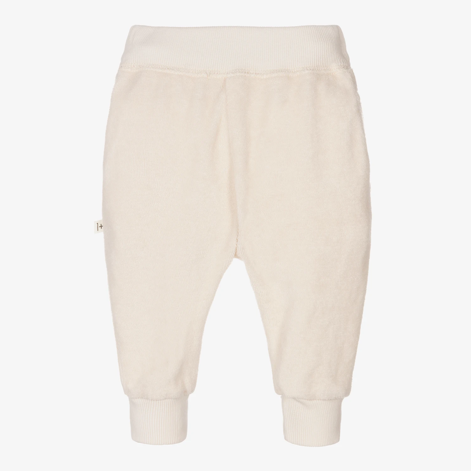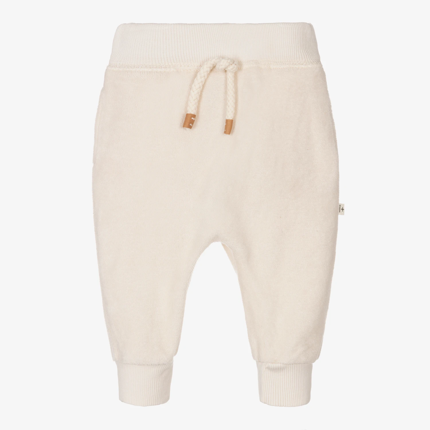 Casual and comfortable ivory joggers for little boys and girls from 1 + in the family. Made in a cotton blend terry towelling, they have cuffed trims and a decorative drawstring on the front.