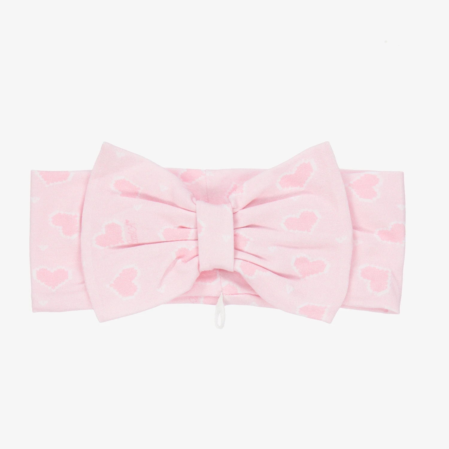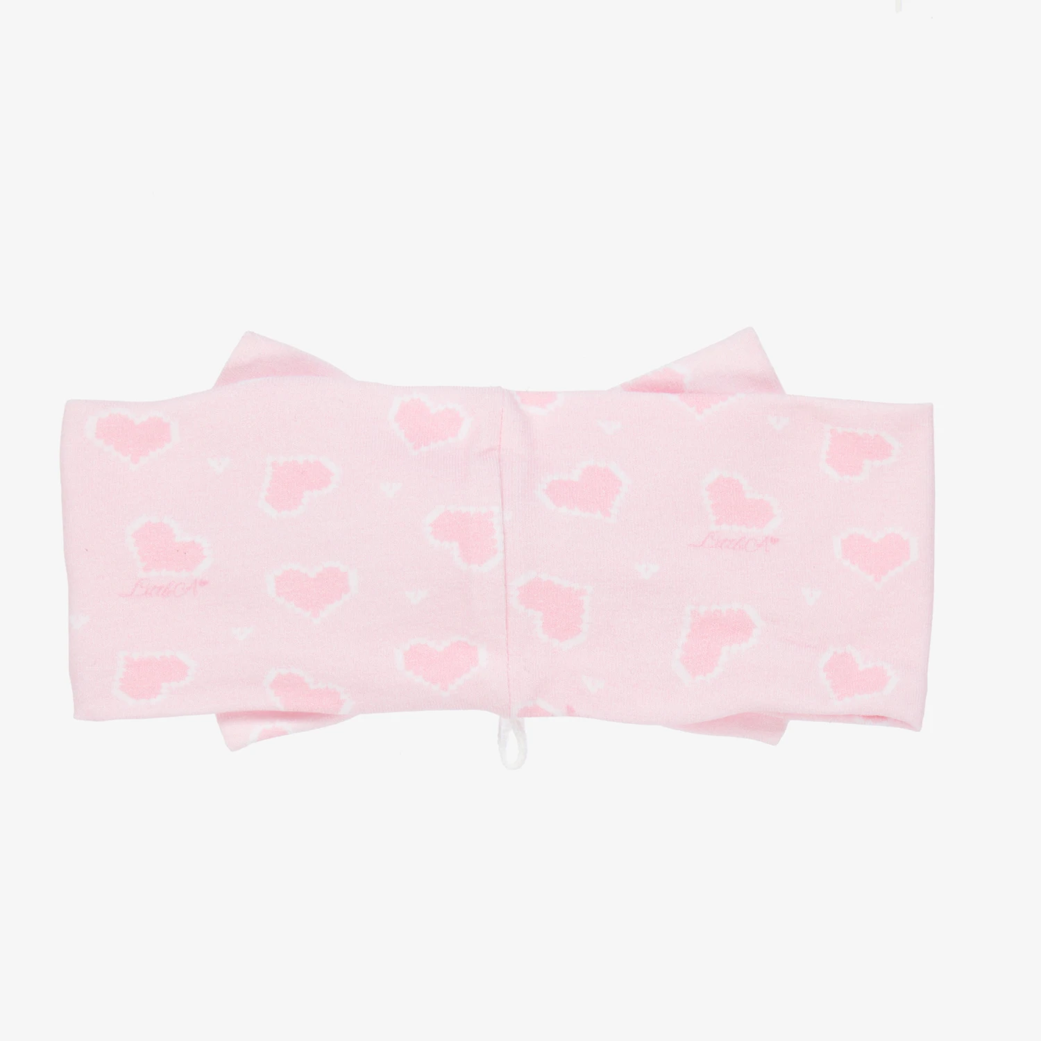 Pale pink headband for girls by A Dee, made in soft cotton jersey. They have an all-over heart print, with a pretty bow on top.