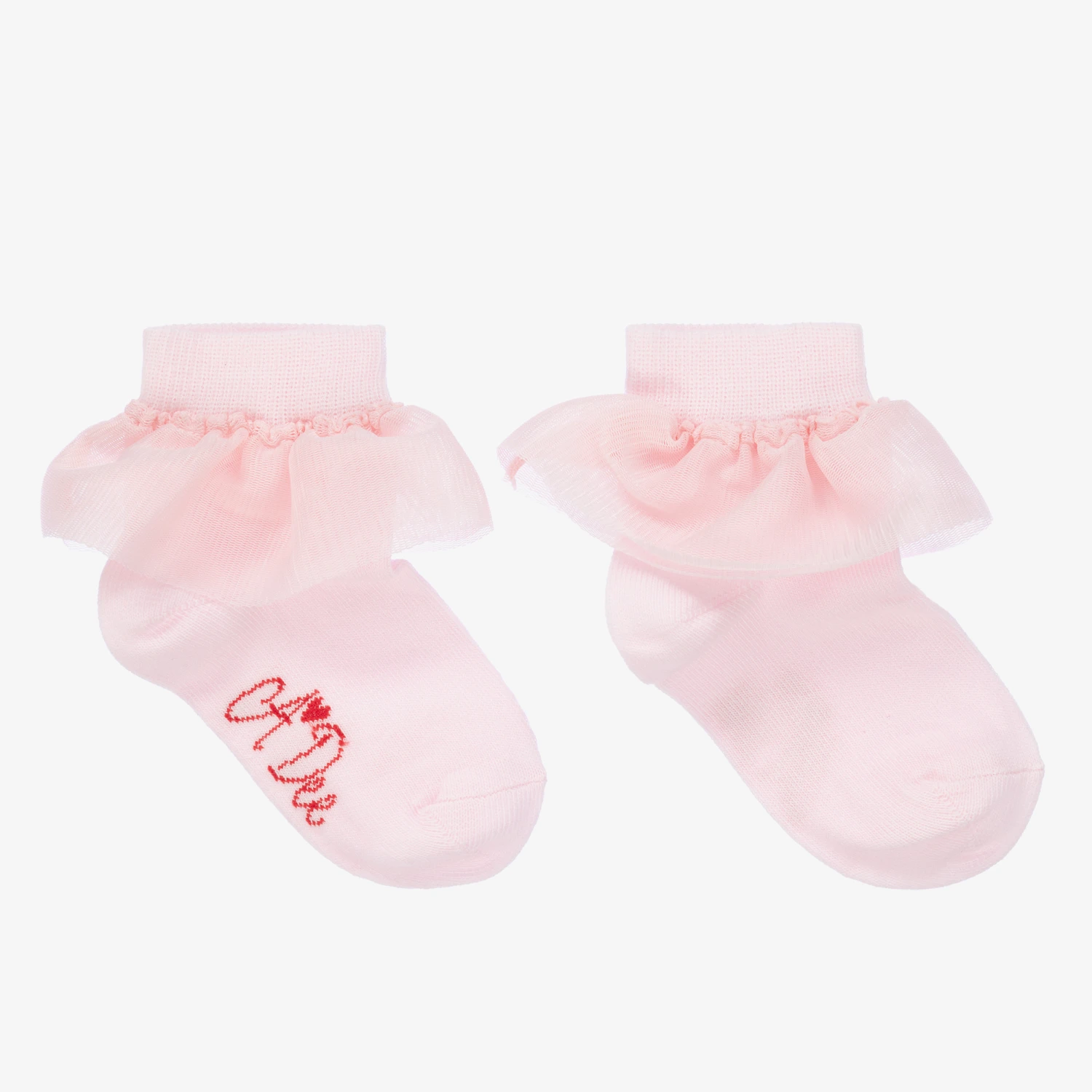 Pretty pink ankle socks for girls from A Dee, with soft tulle trim. Made in a stretchy cotton-rich blend, these comfortable socks have gently ribbed cuffs and patterned red logos on the soles.