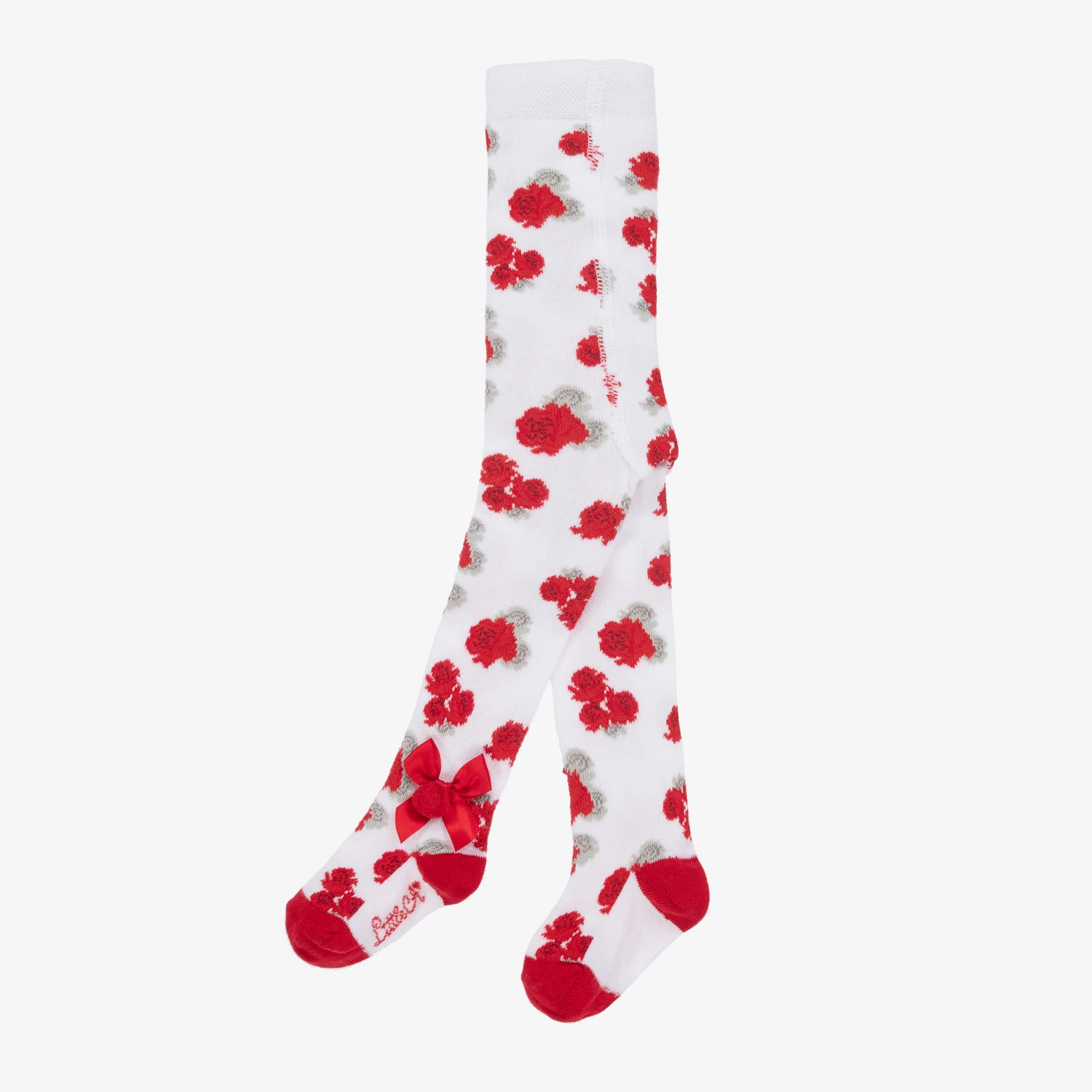 Pretty white tights for little girls from Little A by A Dee, knitted in a soft cotton blend. Stretchy and comfortable they are patterned with red flowers and have satin bows on the side for a feminine finish.