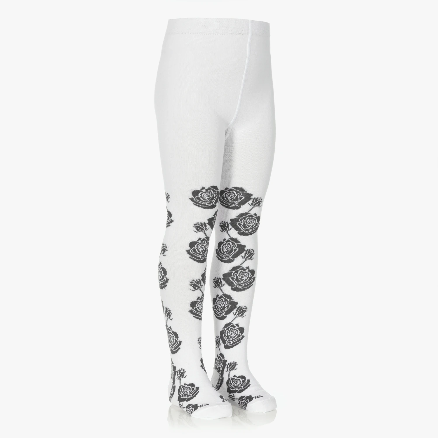 Girls white and grey knitted tights by A Dee. In a soft and stretchy cotton-rich blend, these elegant tights have a grey rose pattern down the sides and an elasticated waist.