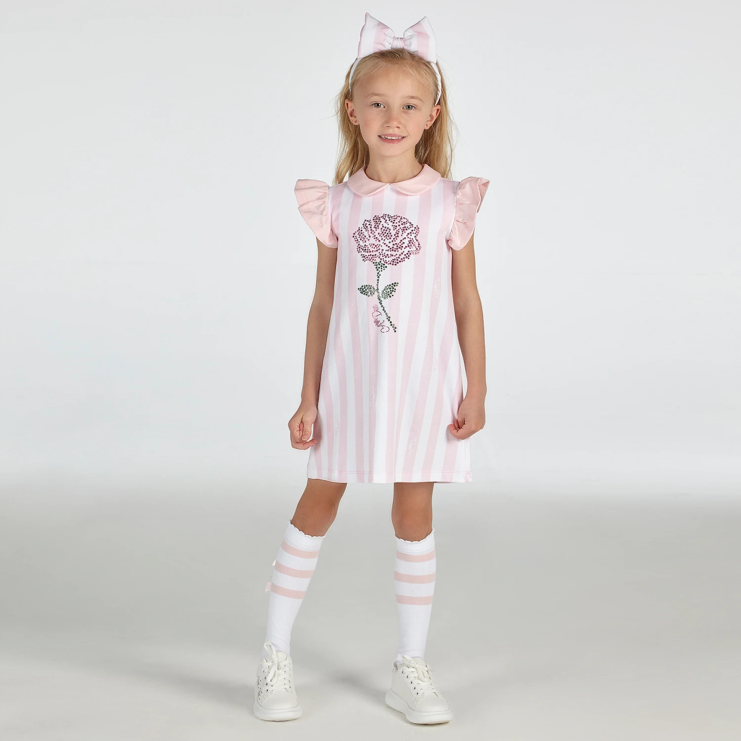 Long white socks for girls by A Dee. Made in a comfortable cotton blend, they have pretty pink stripes with matching satin bows on the sides.
