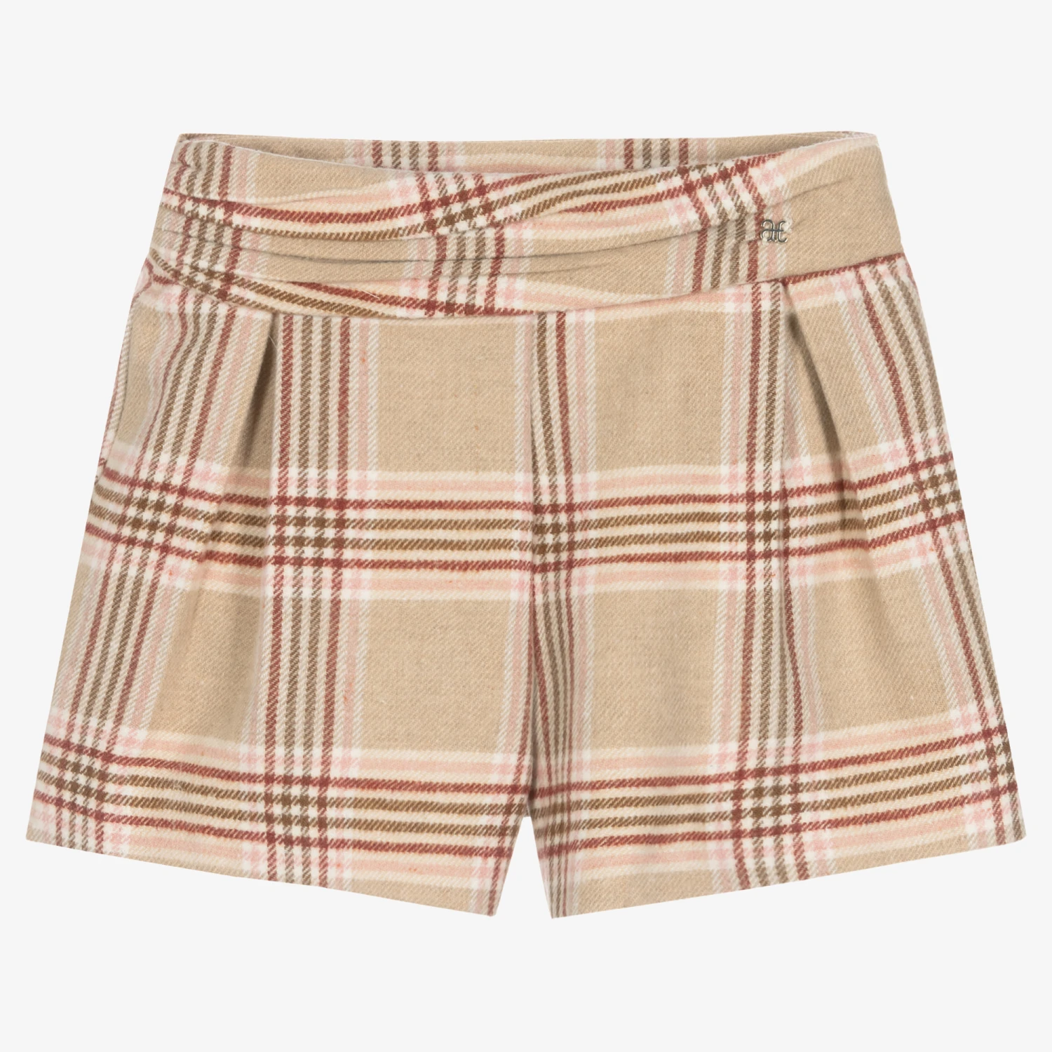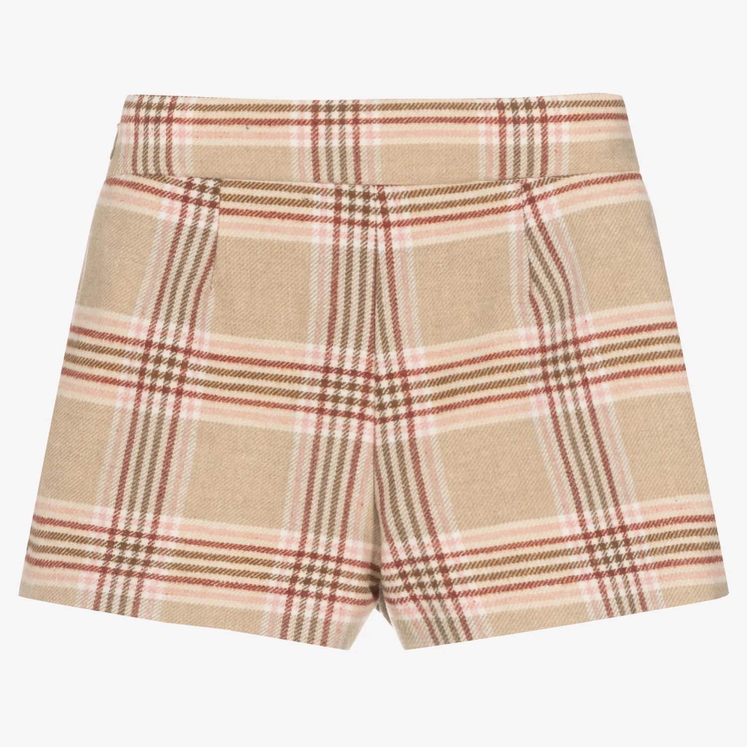 Beige shorts for girls by Abel & Lula, with a pink and brown check pattern. They are made in soft wool-blend flannel and the adjustable waistband is trimmed with a metal logo charm. They fasten with a concealed side zip.