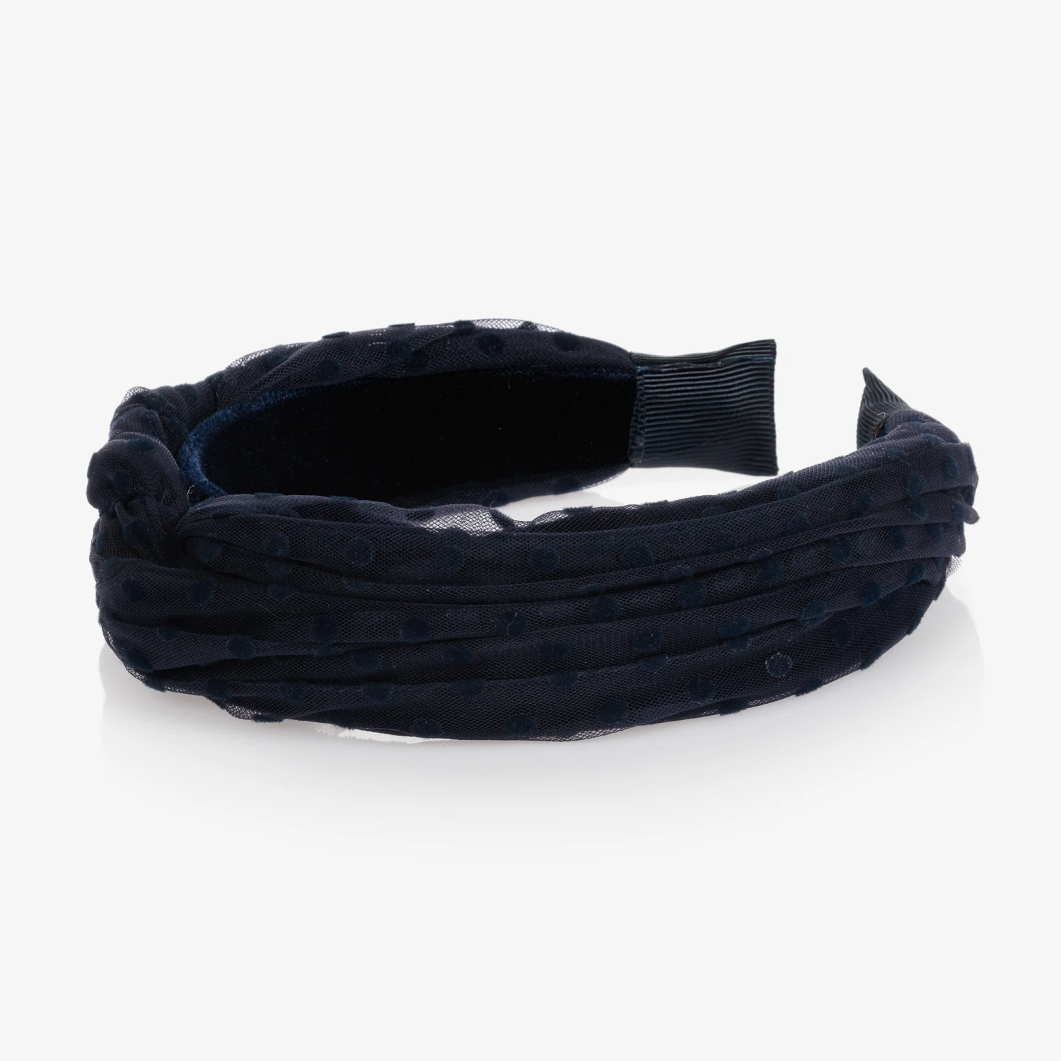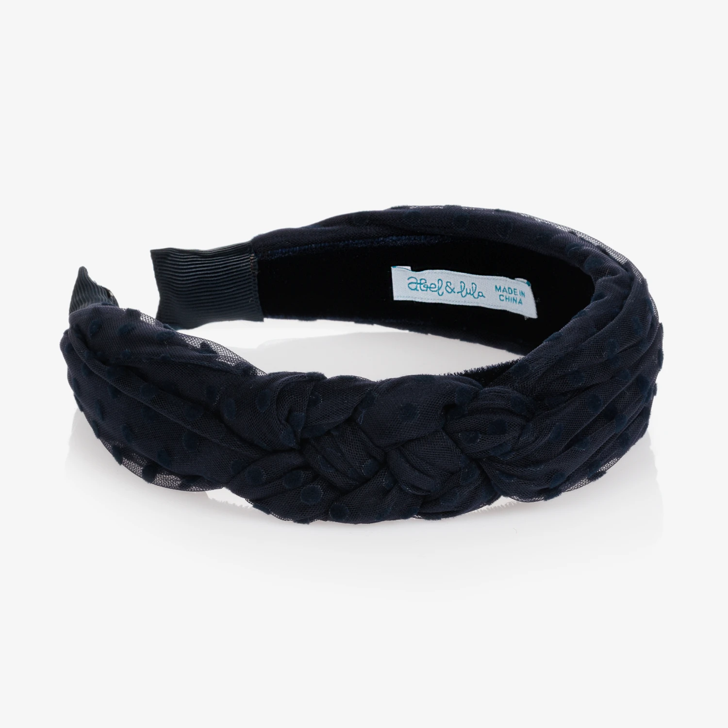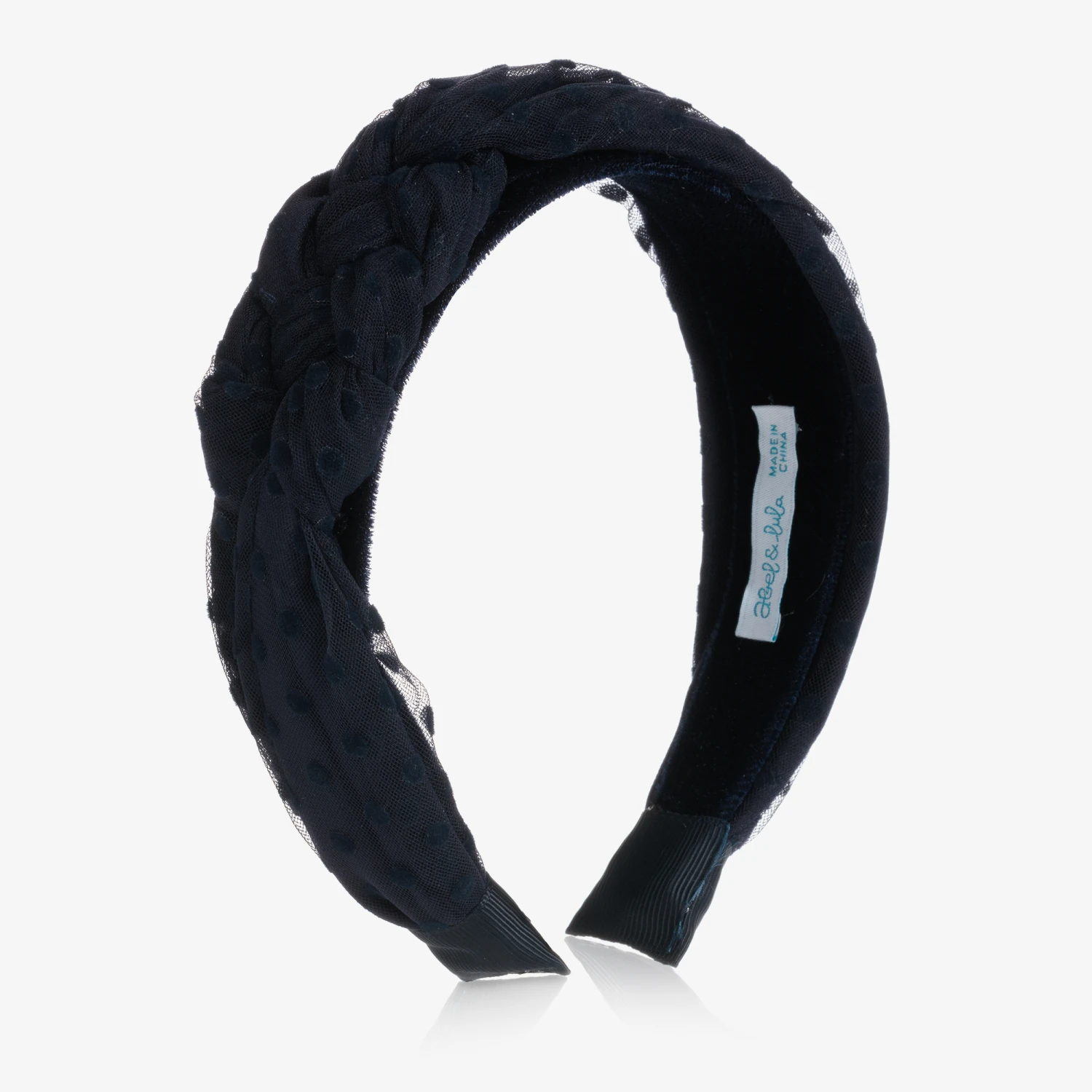 Girls navy blue hairband by Abel & Lula. This pretty hair accessory has a velvet and spotted tulle-covered flexible band that is plaited across the top and is finished at the ends with grosgrain ribbon.