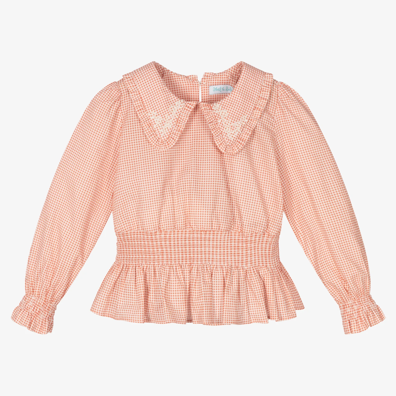 Terracotta pink and ivory gingham blouse for girls by Abel & Lula, with a cute oversized collar. Made in soft cotton poplin, this blouse is embroidered with floral details on the collar and has a panel of shirring on the waist. It is lined in super lightweight cotton voile for cool and comfortable wear.