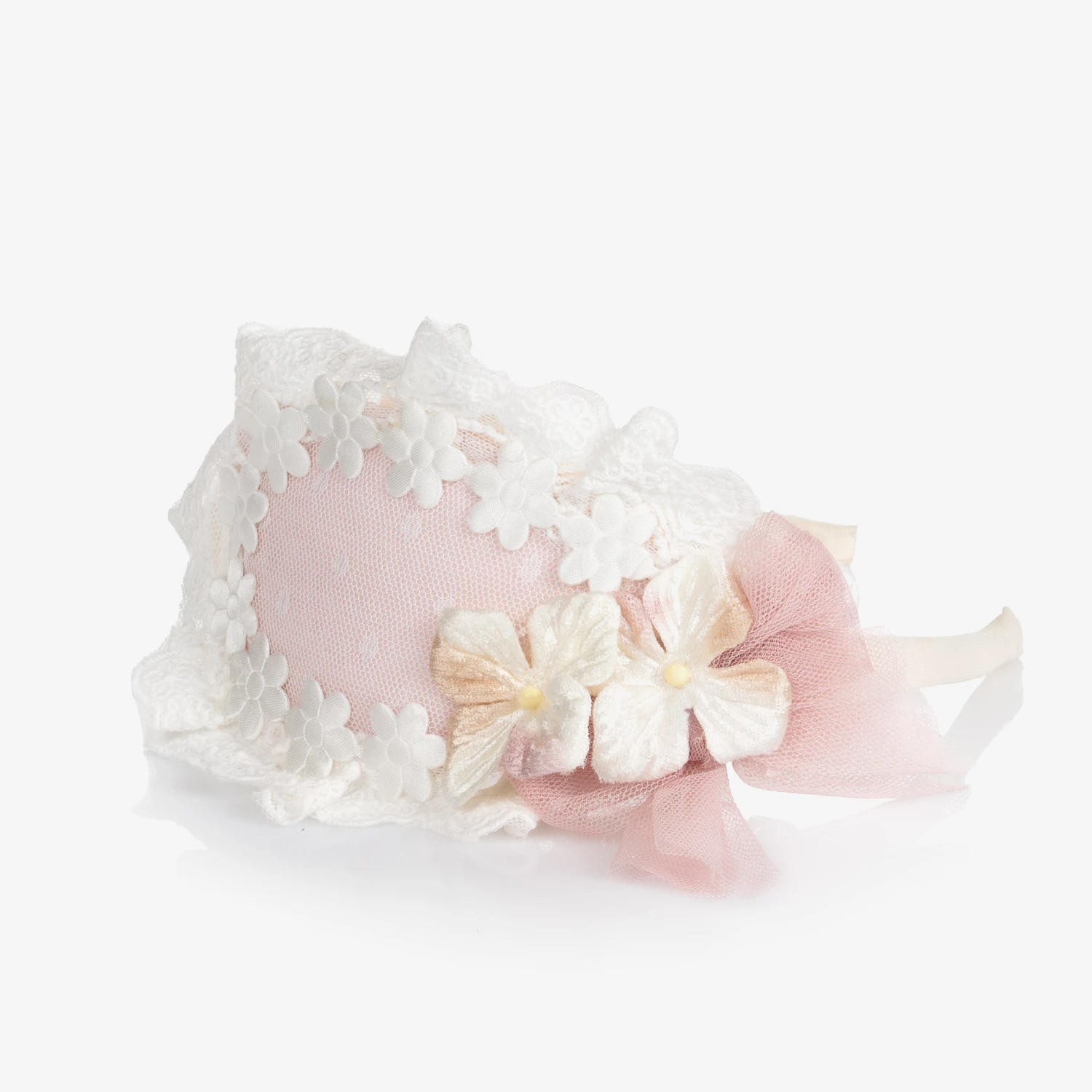 Lovely ivory and pale pink hairband for girls by Abuela Tata, with a flexible ivory fabric-covered band. Ideal for special occasions, it has a tulle decoration trimmed with delicate lace. There is also a bow appliqué and super sweet ivory flowers.