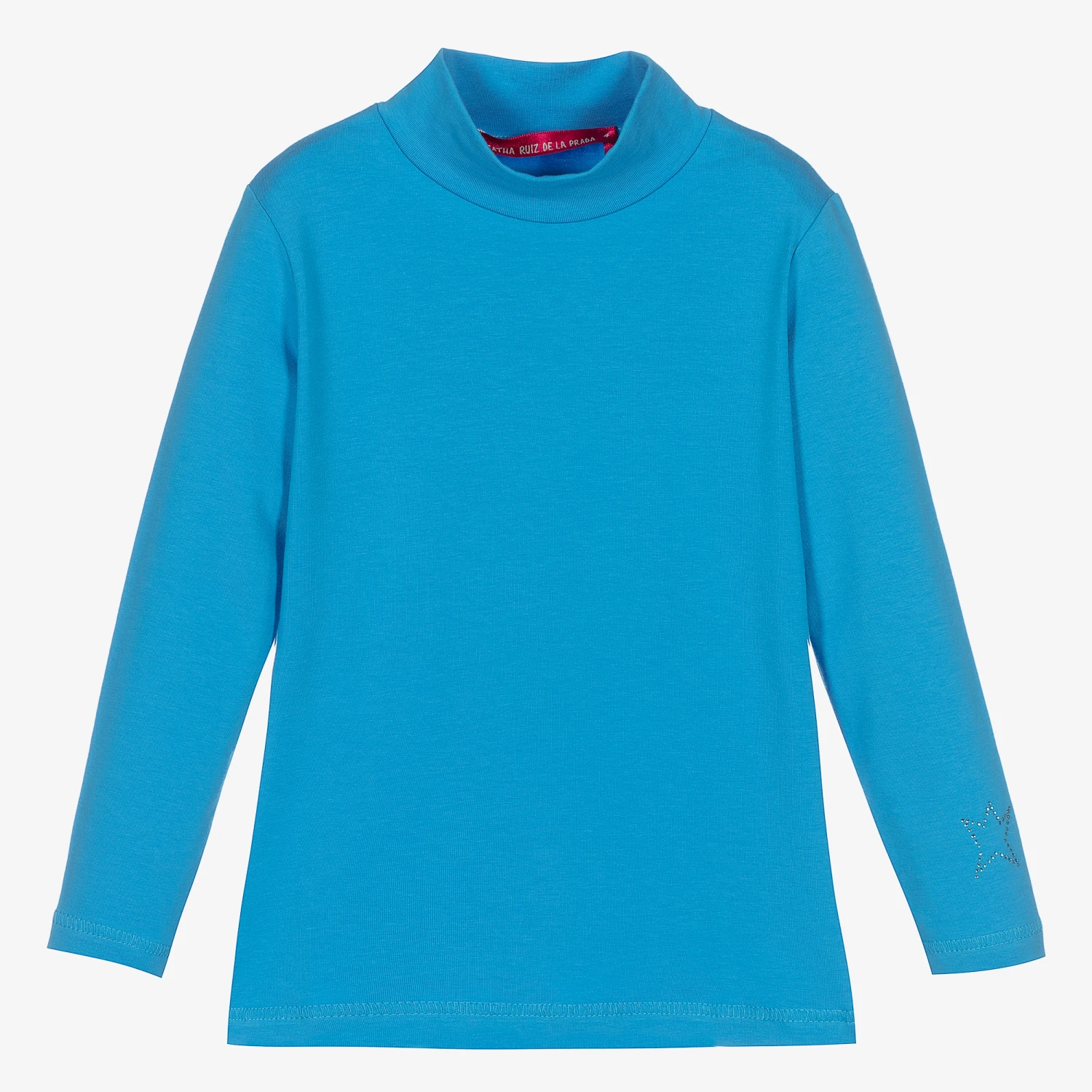Girls turquoise blue, turtle neck top by Agatha Ruiz de la Prada. Made in soft and stretchy cotton jersey, it has a sparkly blue diamanté star and logo design on one cuff.