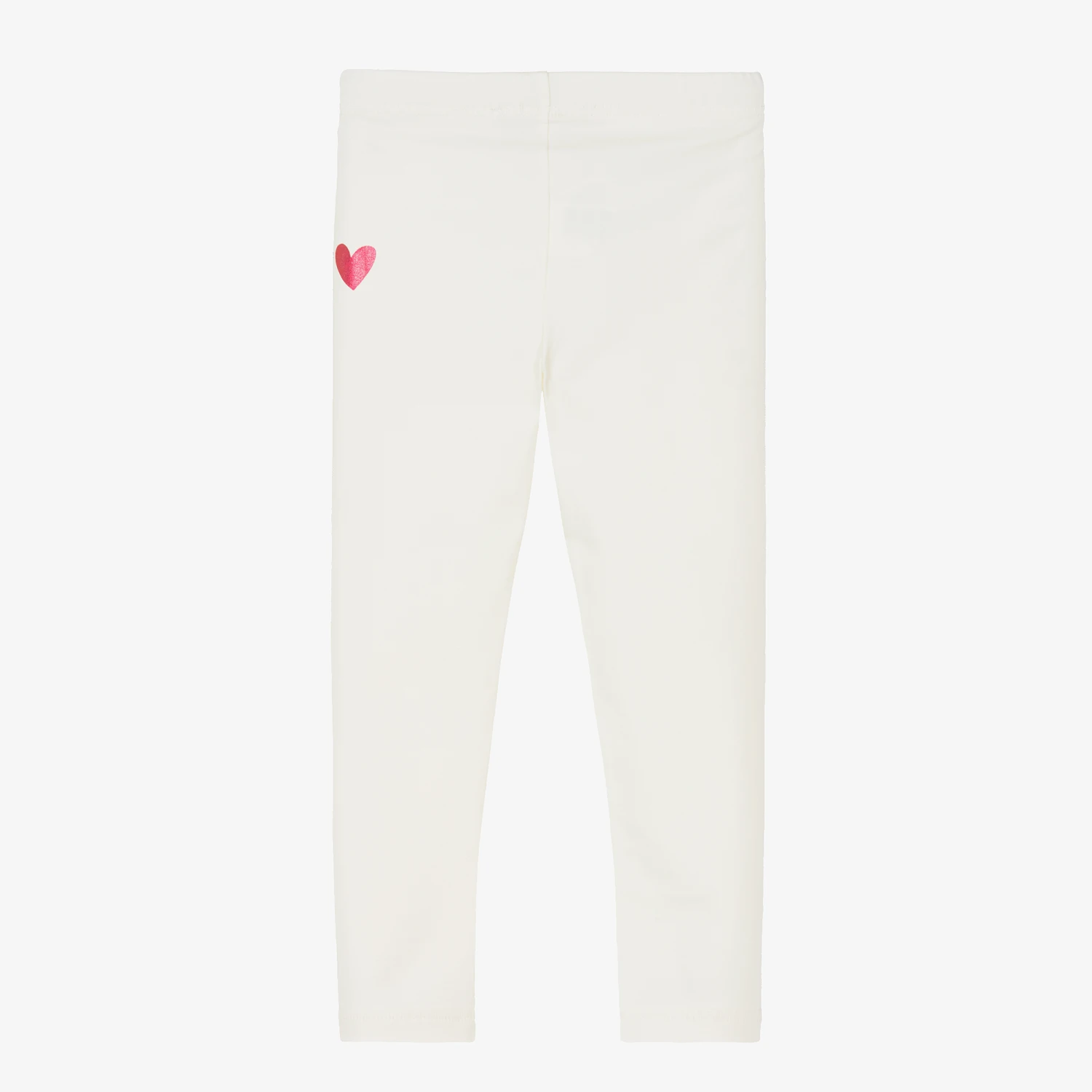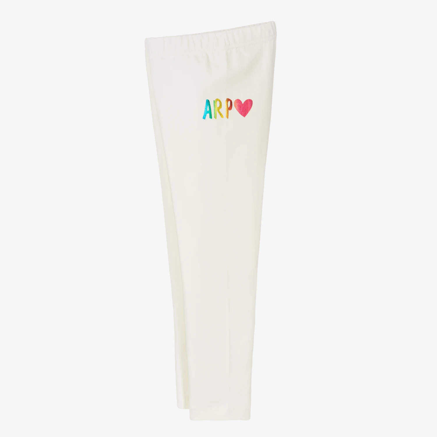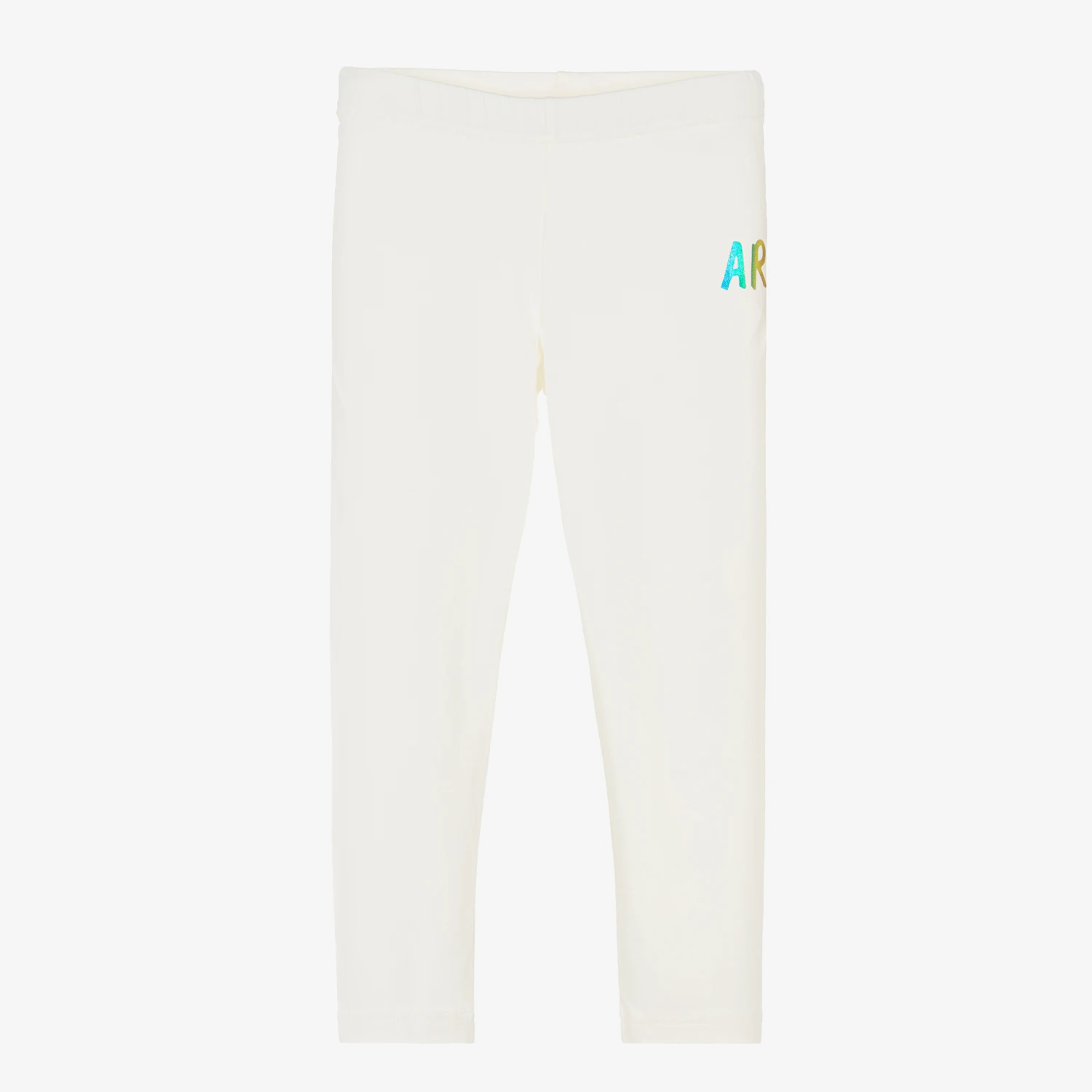 Ivory leggings for girls by Agatha Ruiz de la Prada, made in soft, stretchy cotton blend jersey. These comfortable, full-length leggings have a multicoloured metallic logo on the front for a designer finish.