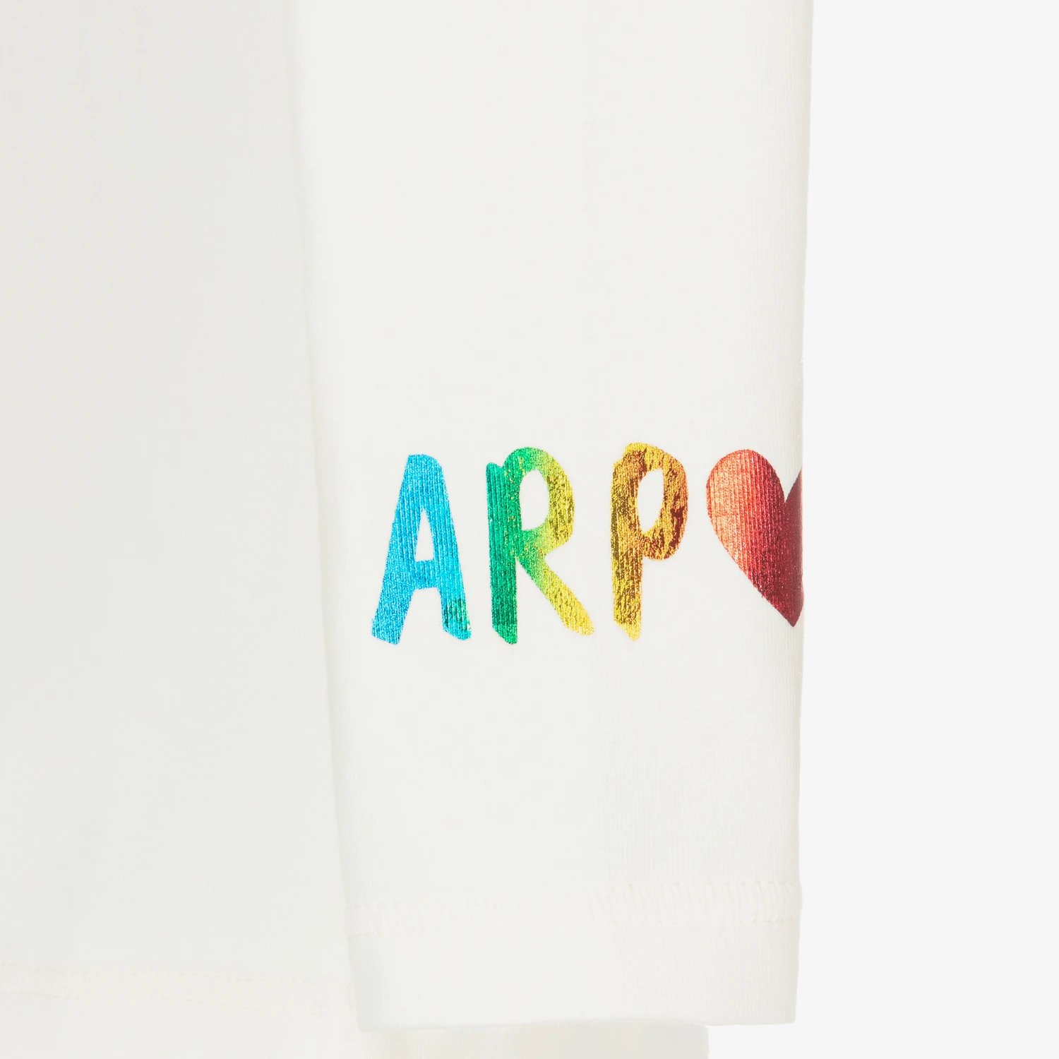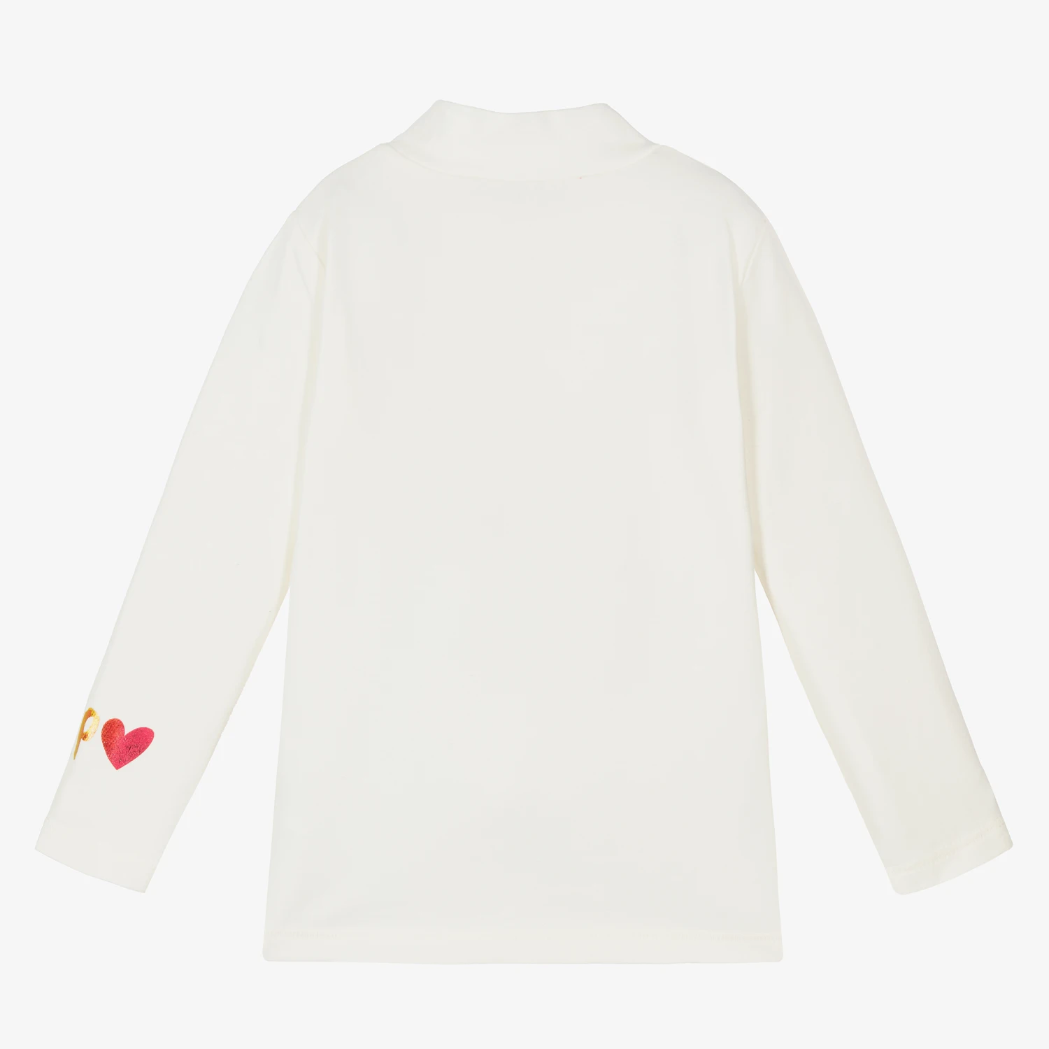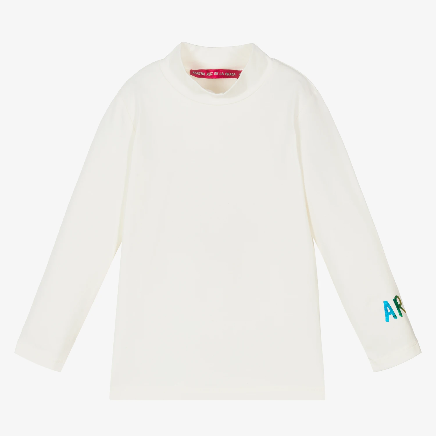 Ivory roll neck top for girls by Agatha Ruiz de la Prada, made in soft and stretchy cotton blend jersey. This comfortable top has a multicoloured, metallic initial logo on one sleeve for a designer touch.