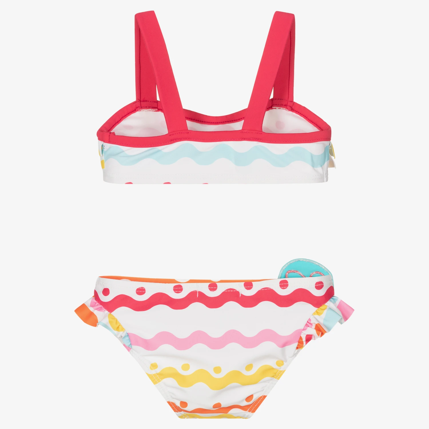 Multicolour bikini for girls, with a spot and squiggle pattern, by Agatha Ruiz de la Prada. Fun and vibrant, the top has layered ruffle trims and bold pink shoulder straps. The bottoms have a rubberised logo on the front and an eye-catching heart appliqué, with frilly trims on the side.