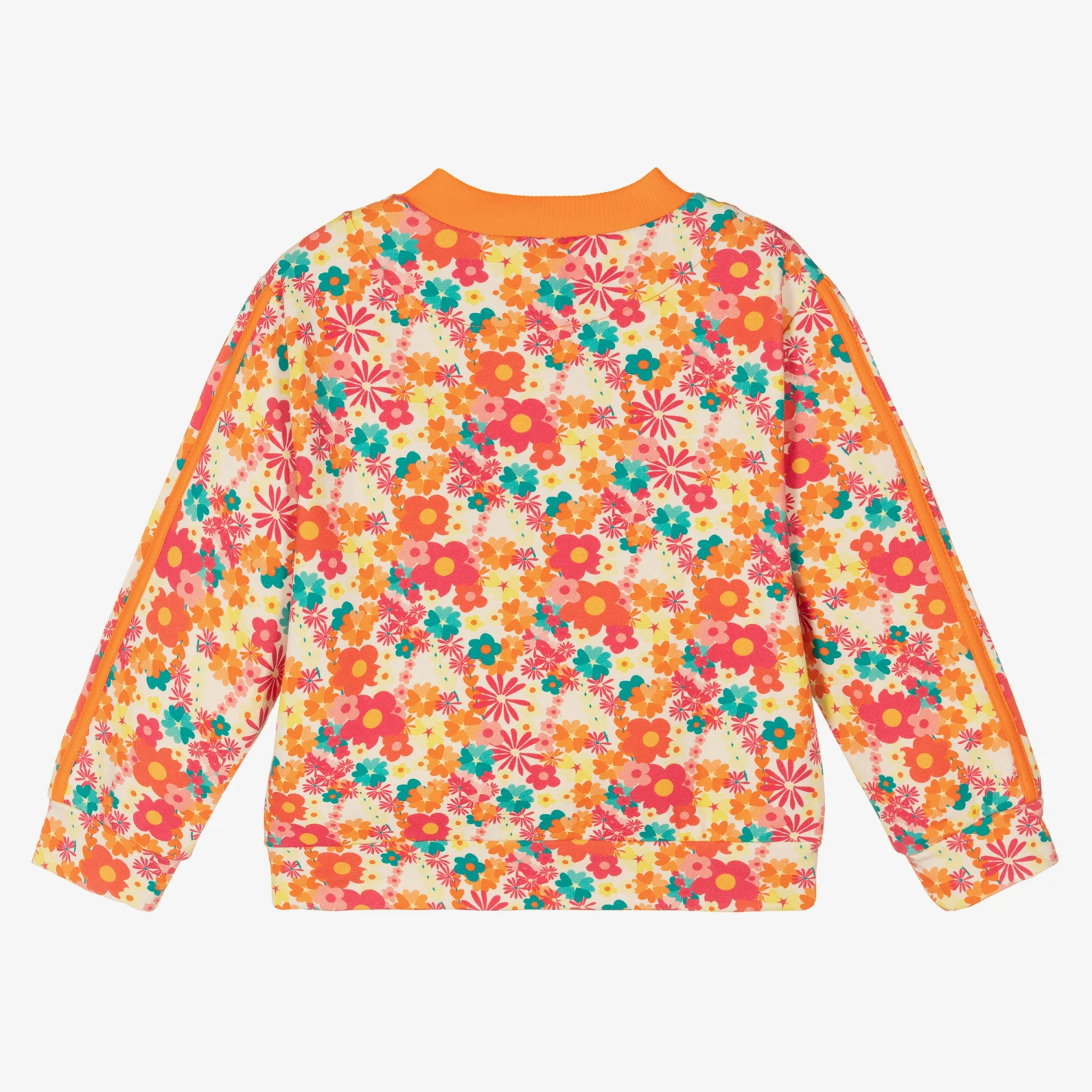 Orange zip-up top for girls by Agatha Ruiz de la Prada, made in soft mid-weight cotton jersey. Patterned in a ditsy floral print, it has a sequin flower motif on the chest for a touch of sparkle. It has an exposed orange zip fastening on the front and concealed side seam pockets.