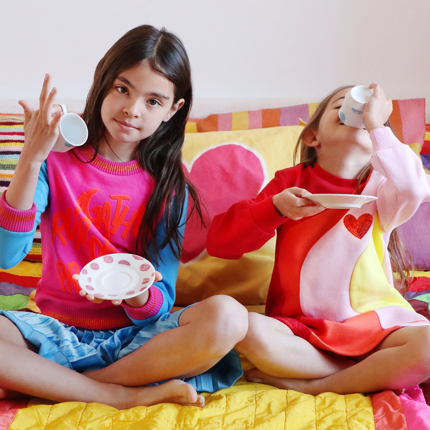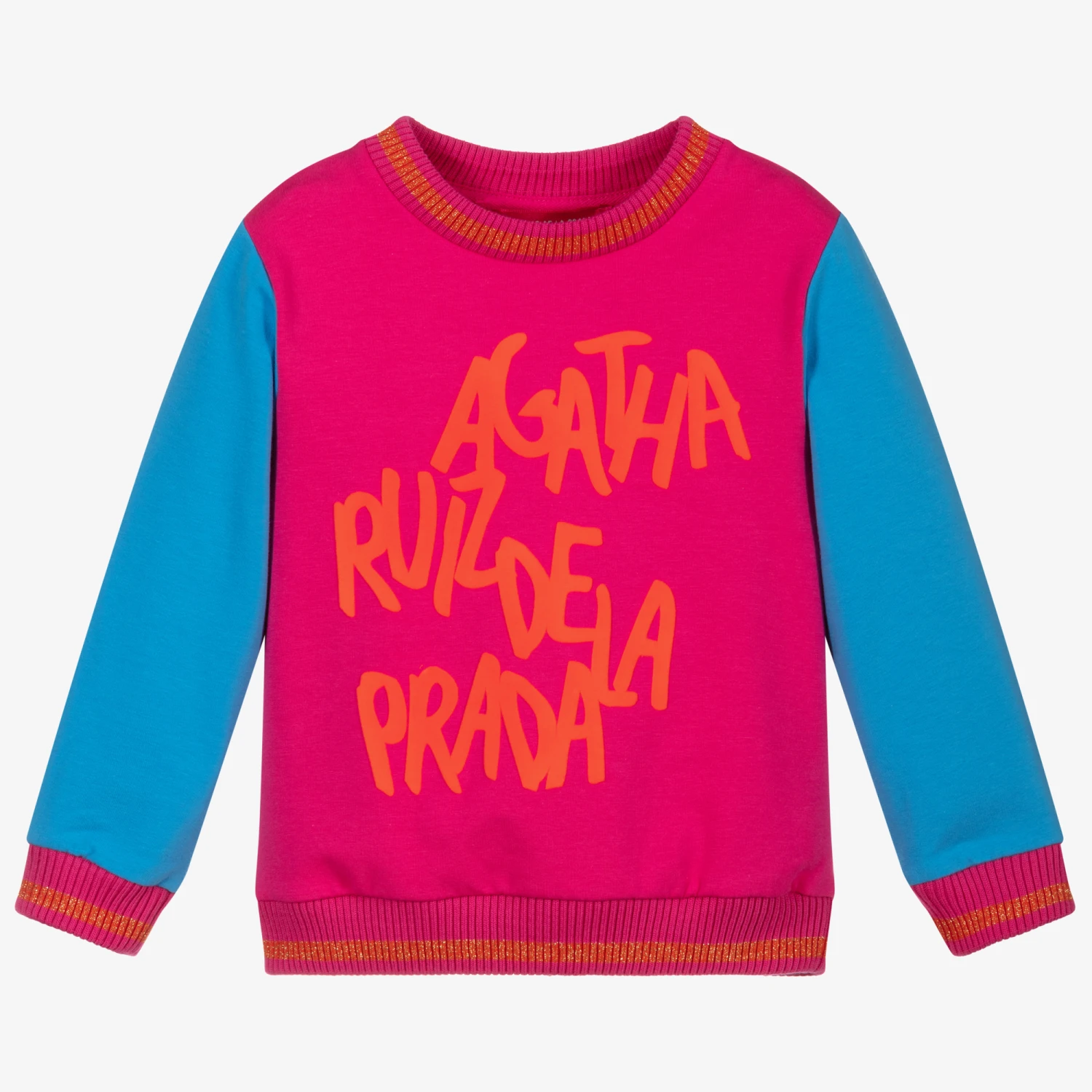 Girls pink sweatshirt by Agatha Ruiz de la Prada, with contrasting blue sleeves and gold sparkle details. It is made in soft cotton jersey with a fleecy inside and has a red velvet printed logo on the front.