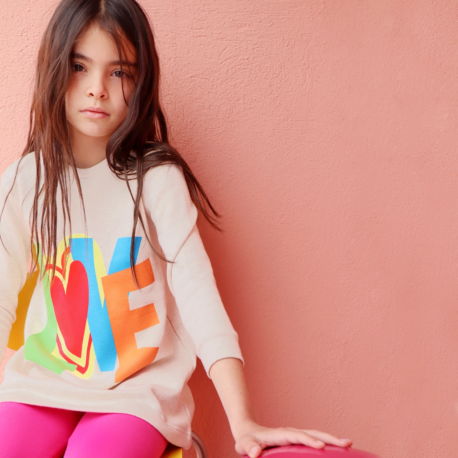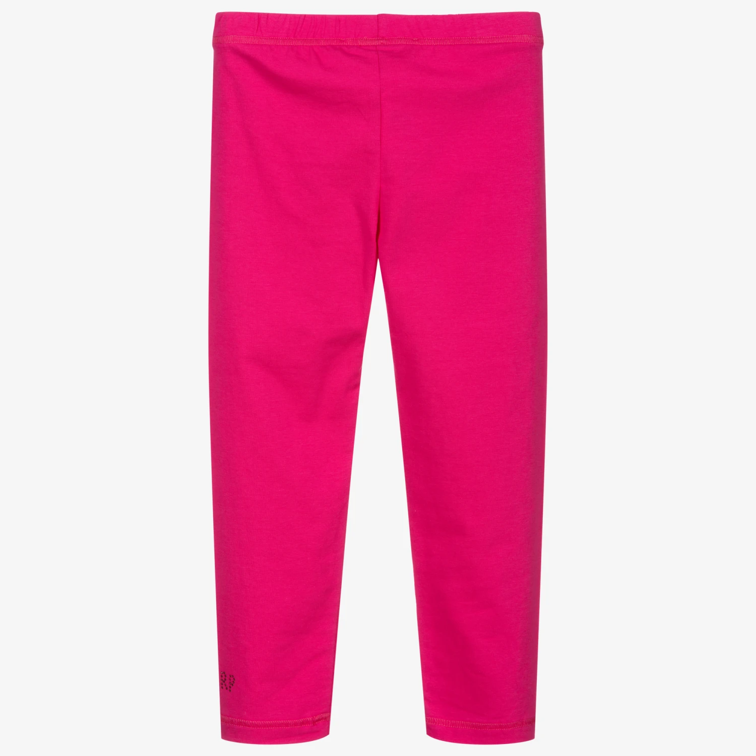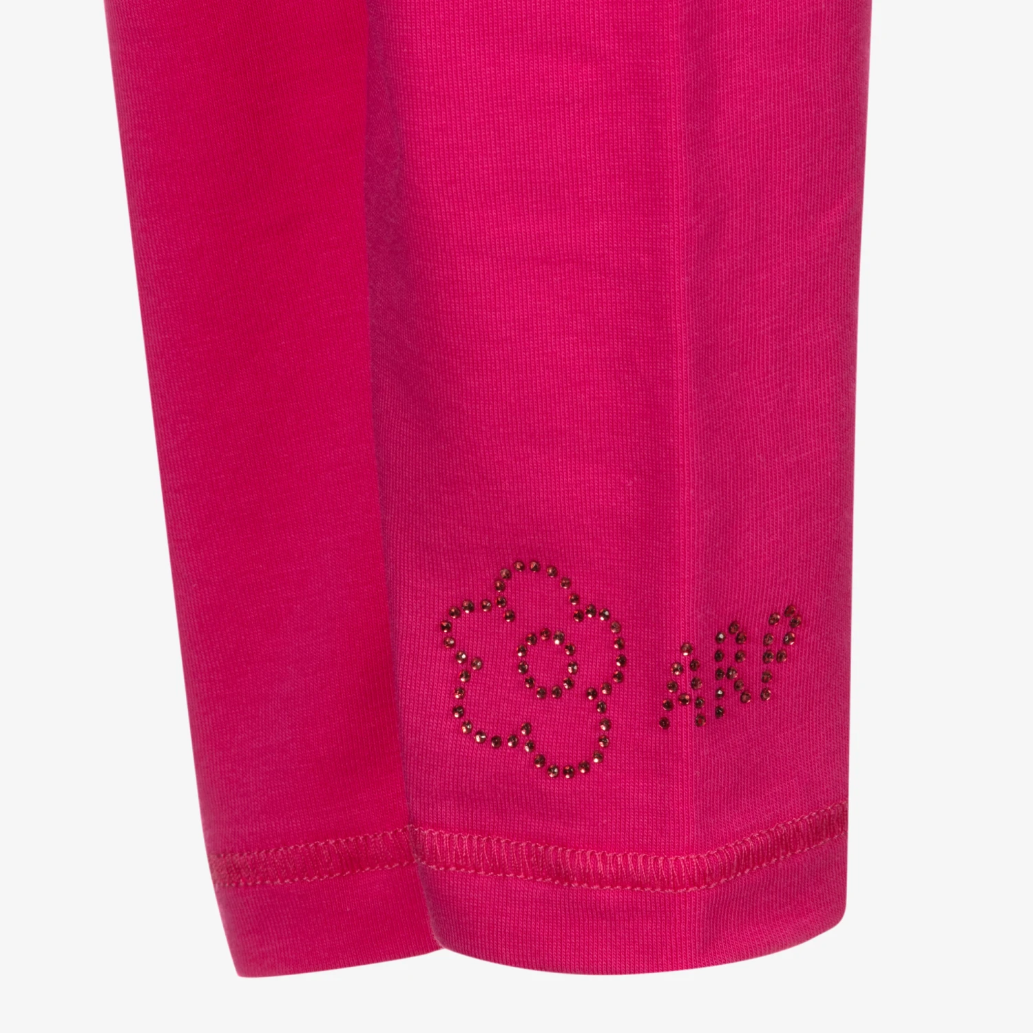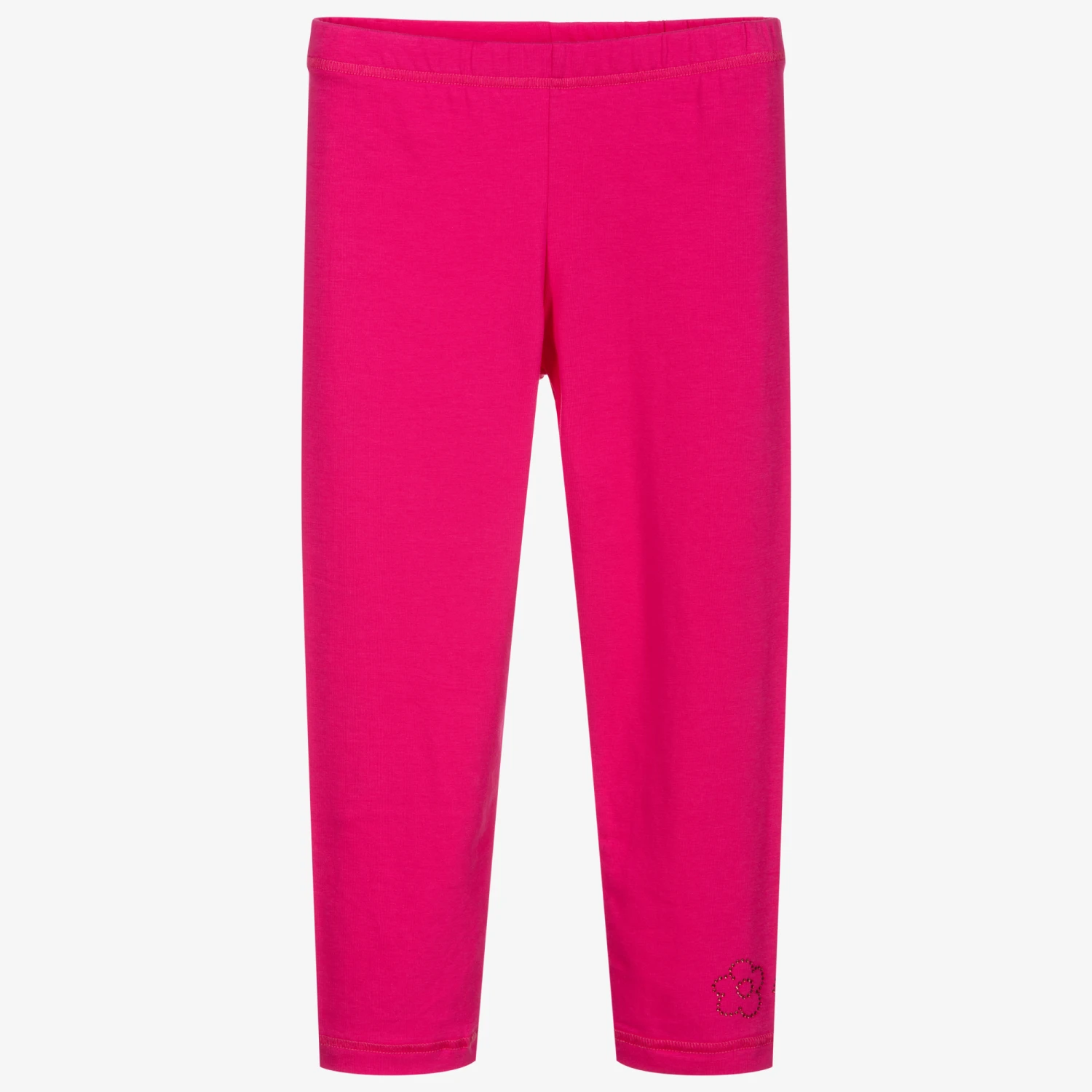 Bright pink girls leggings, by Agatha Ruiz de la Prada. Made from soft and stretchy cotton jersey, they have a cute logo and flower design in pink diamantés at the ankle.