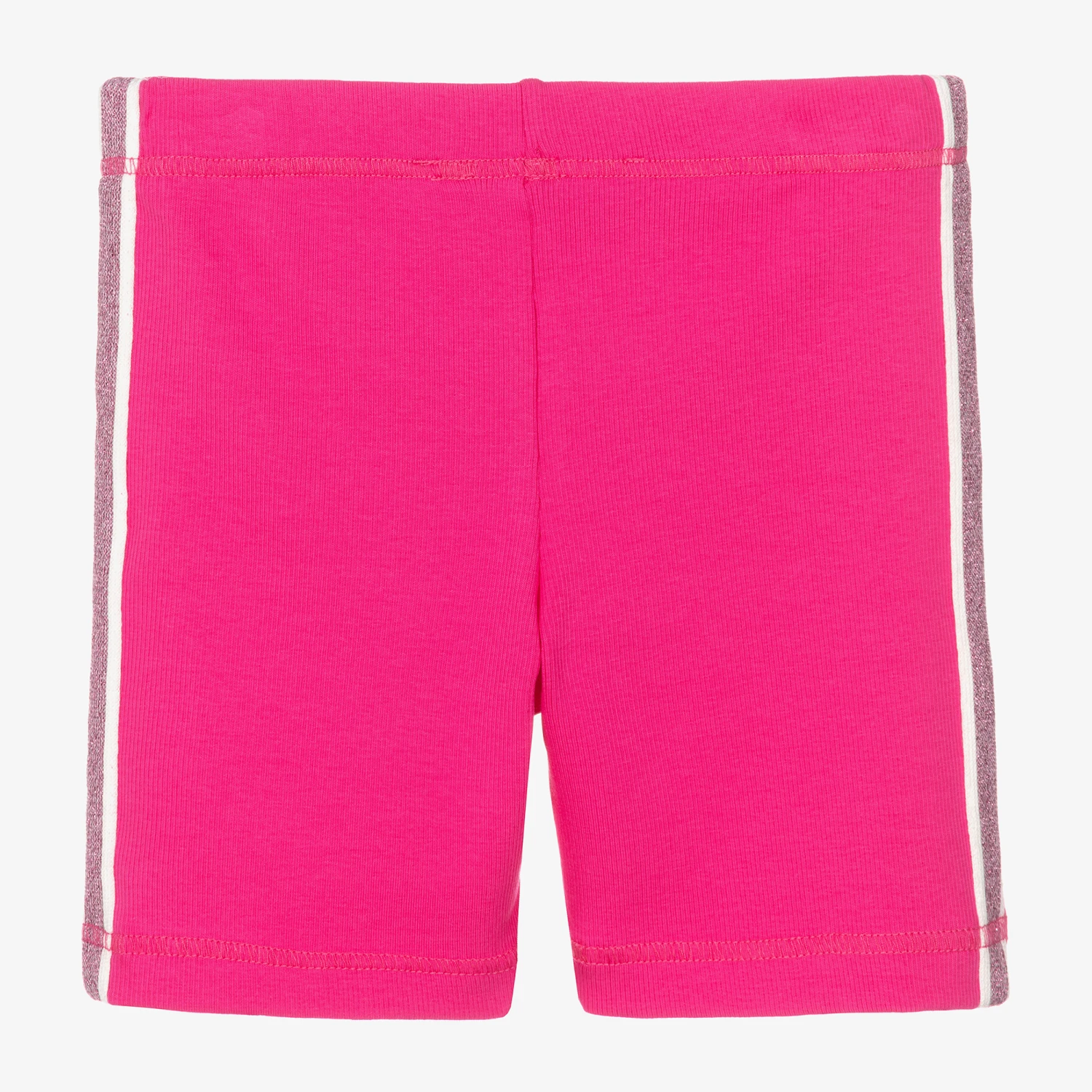 Bright pink shorts for girls by Agatha Ruiz de la Prada, with white and sparkly pink taping along the sides. Made in comfortable, ribbed cotton jersey, they have an elasticated waistband and the brand’s logo embroidered on one side in neon orange, green and yellow.