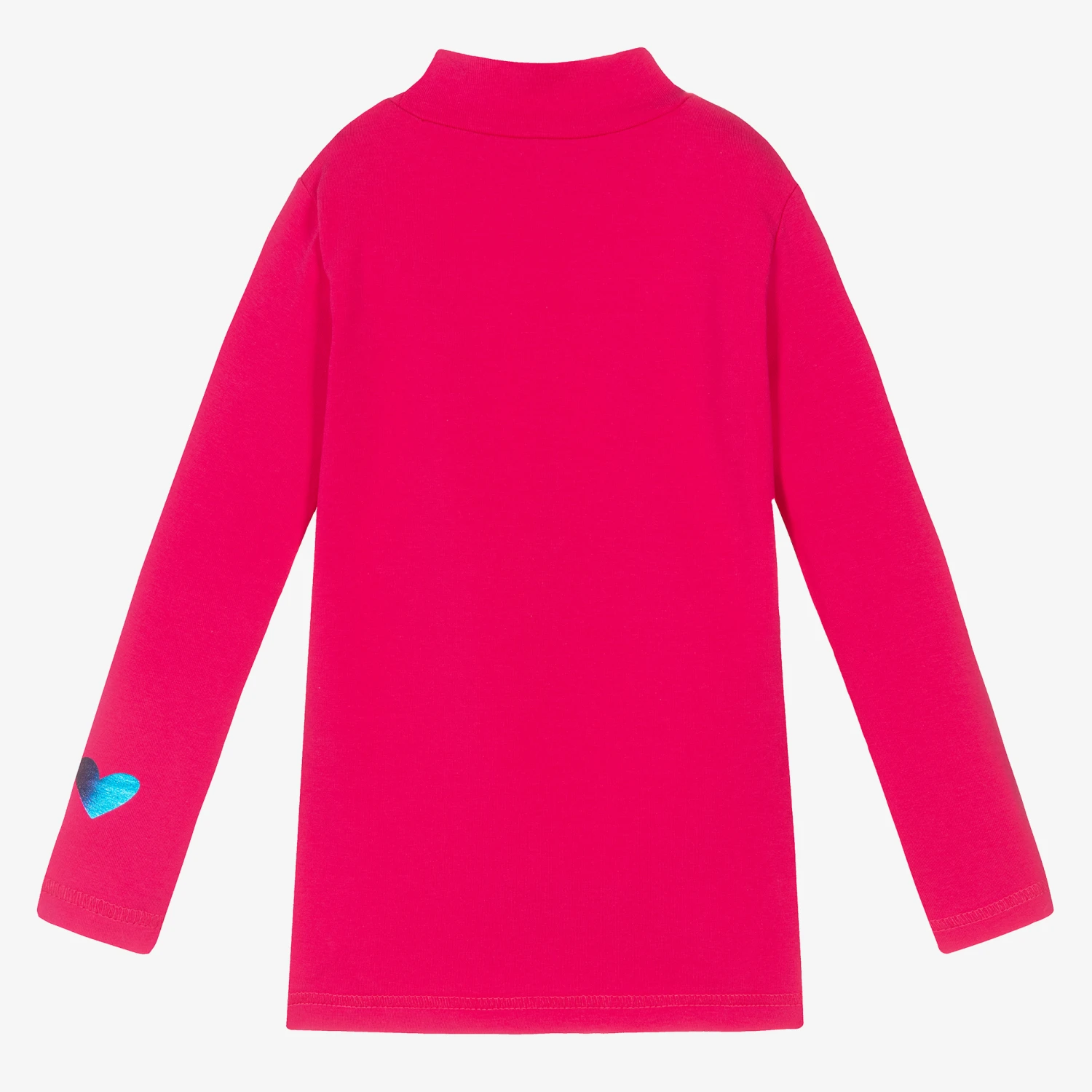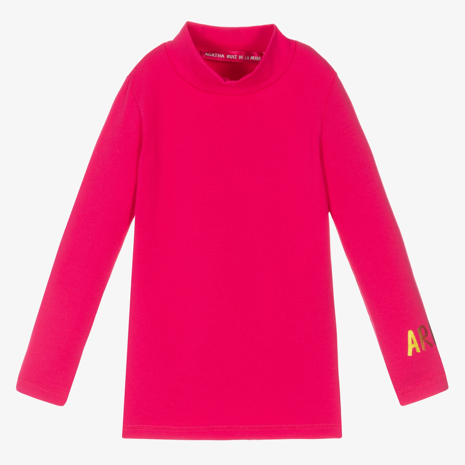Bright pink roll neck top for girls by Agatha Ruiz de la Prada, made in soft and stretchy cotton blend jersey. This comfortable top has a multicoloured, metallic initial logo on one sleeve for a designer touch.