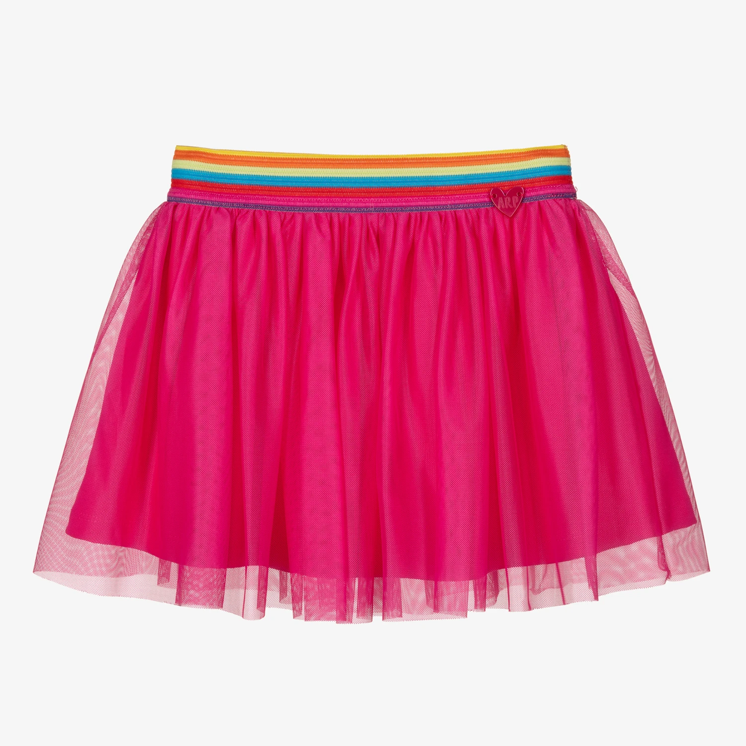Bright pink skirt for girls by Agatha Ruiz de la Prada. Made in lightweight tulle with a comfortable cotton jersey lining, it has a colourful, striped, elasticated waistband with the brand’s logo heart charm sewn on one side.