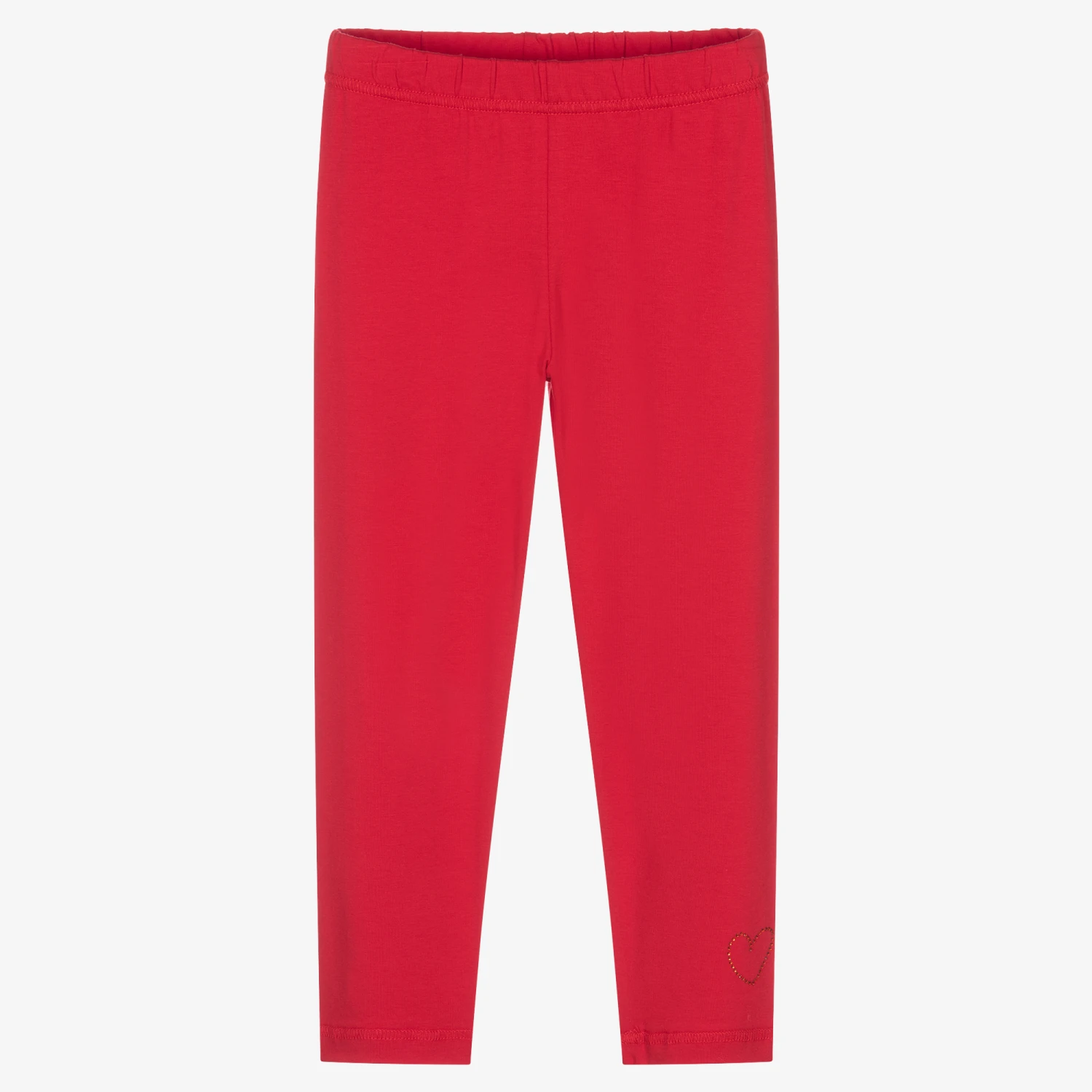 Red leggings for girls by Agatha Ruiz de la Prada. Made from soft and stretchy cotton jersey, they have a heart and logo design in red diamantés at the ankle.