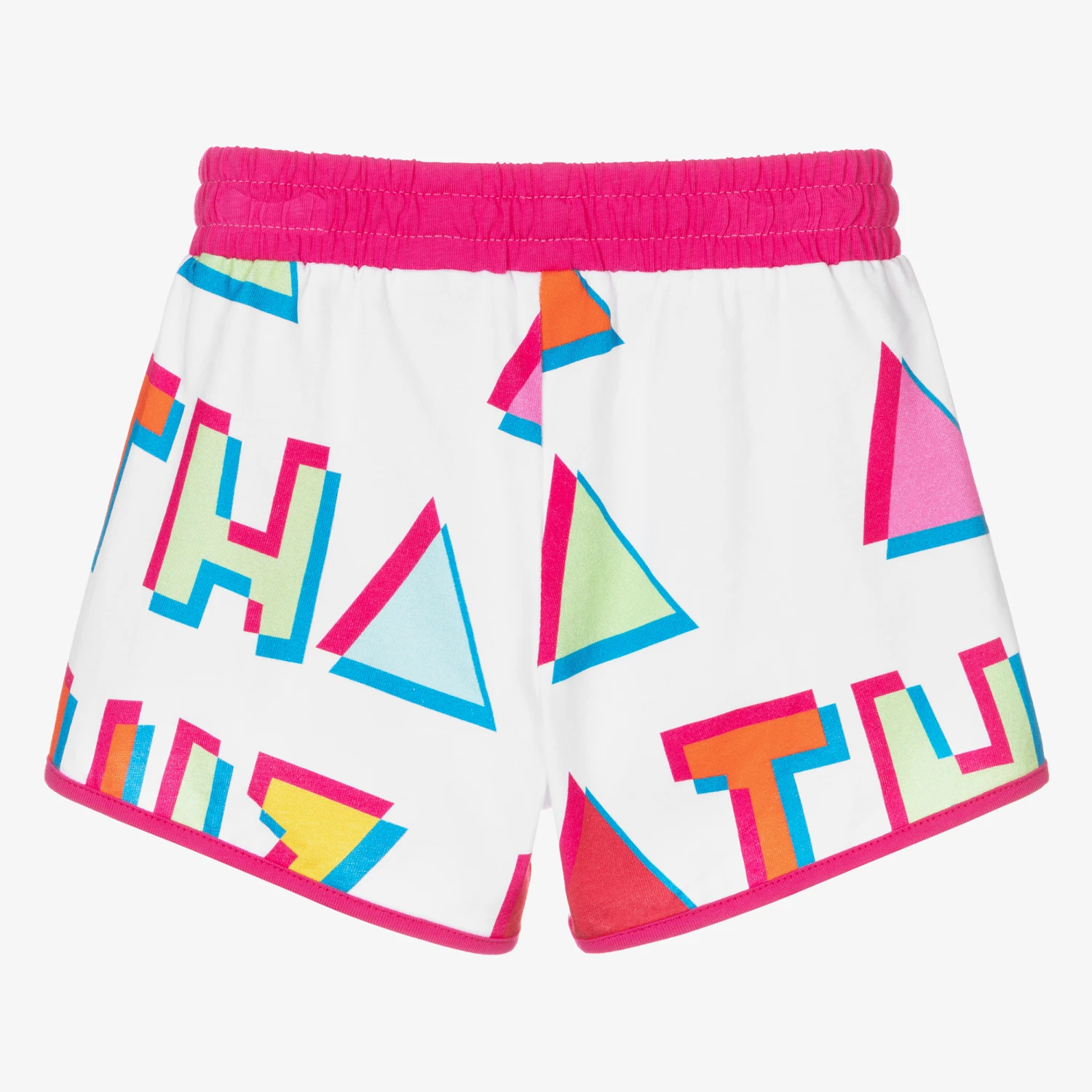 Girls white shorts from Agatha Ruiz De La Prada, with a colourful logo pattern and fuchsia pink trims. They are made in soft and stretchy cotton jersey, with an elasticated waistband.