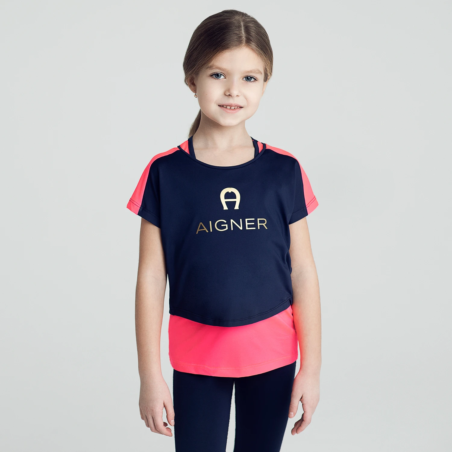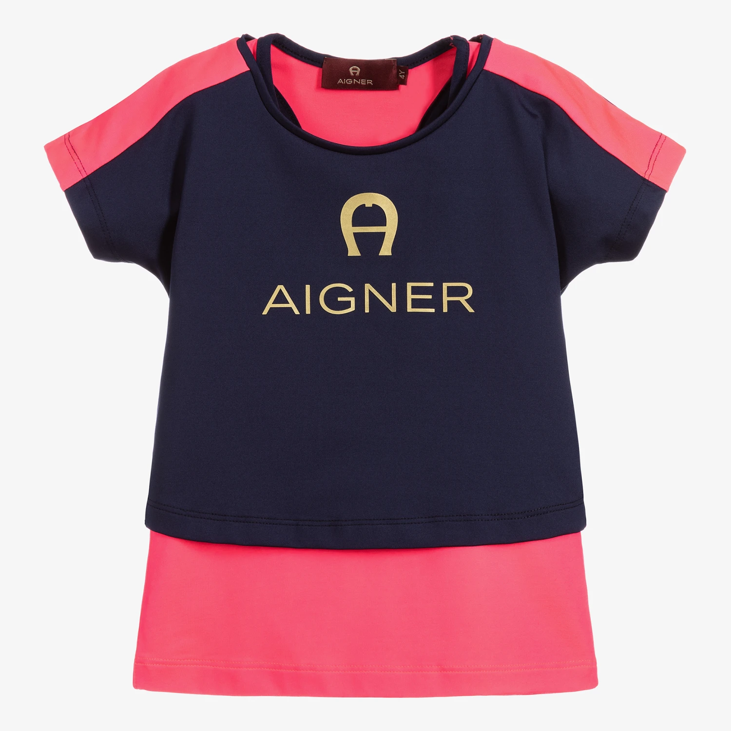 AIGNER navy blue and pink sports T-shirt set for girls, made in stretchy, breathable jersey. Keeping girls cool and comfortable when active, they can be worn separately or together. The pink sleeveless top has blue trims and the blue cropped top has pink shoulder inserts. Both pieces have the brand’s signature ‘A’ horseshoe logo, in gold on the front.