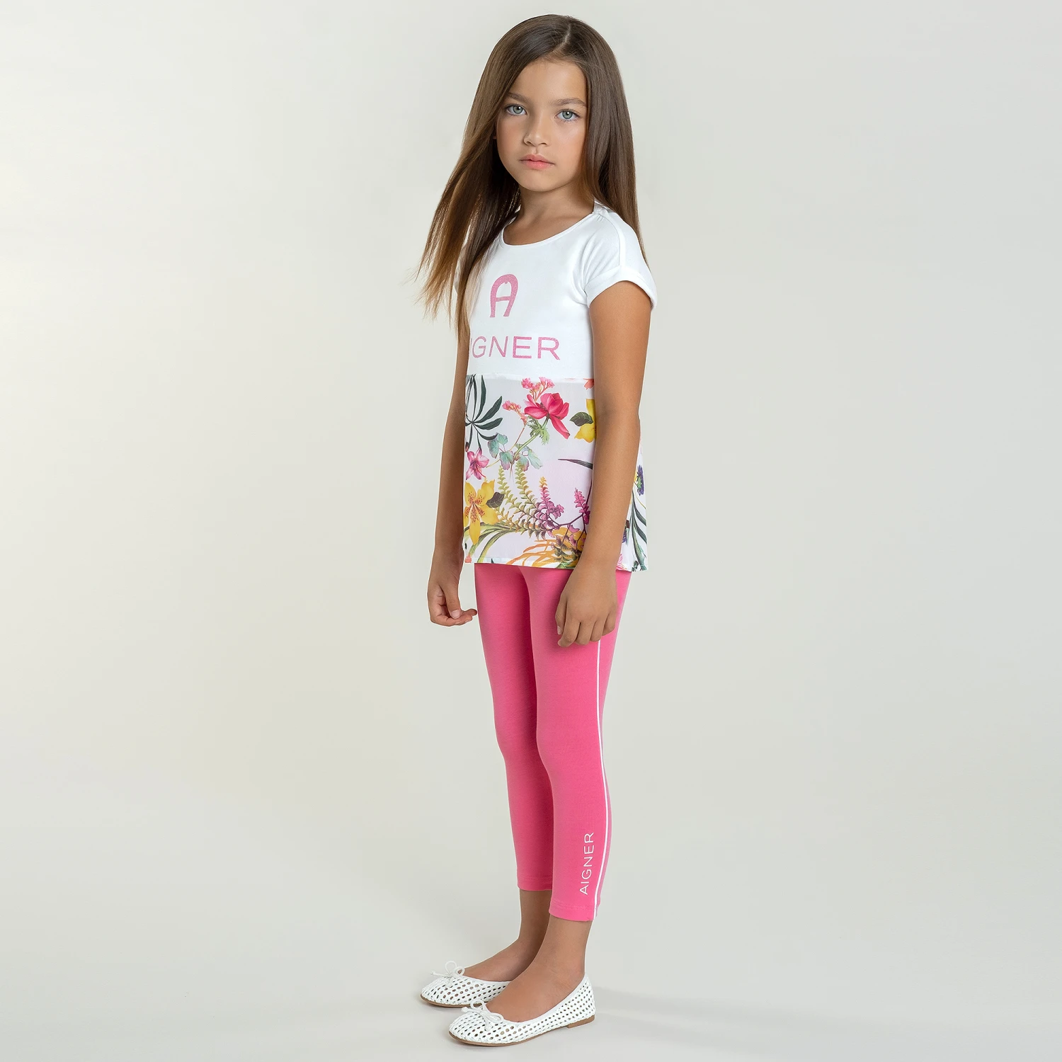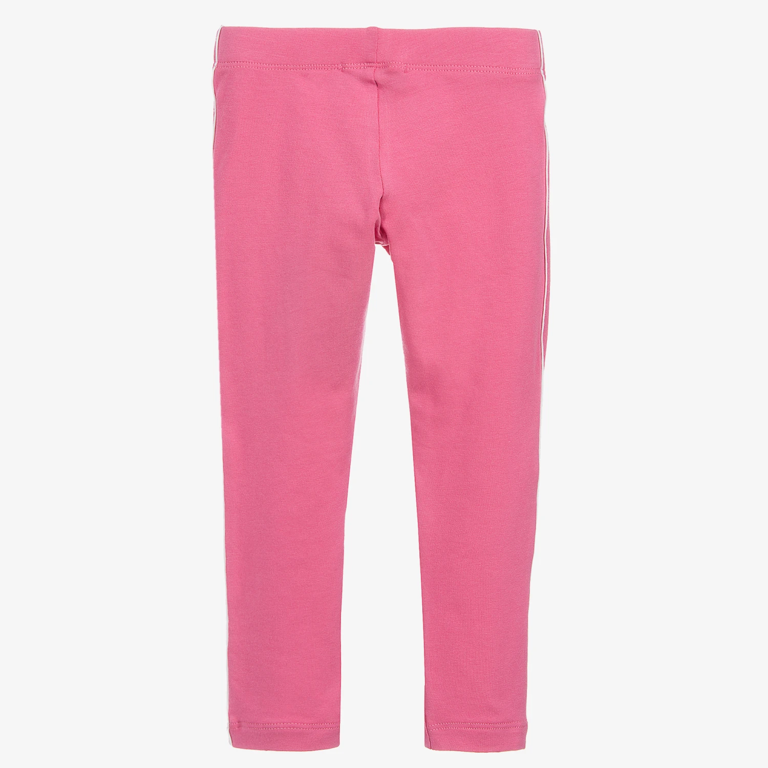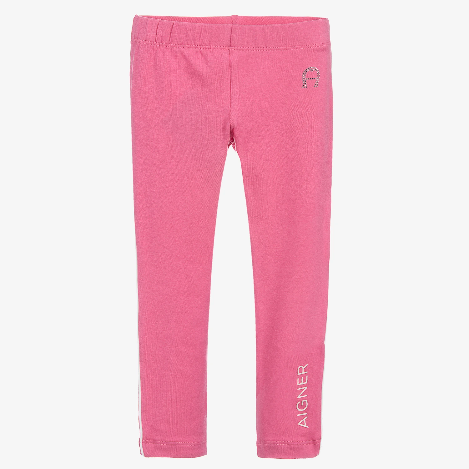 Girls pink cotton jersey leggings by AIGNER. With a sparkly diamanté signature ‘A’ on the front, and white piping down each leg.
