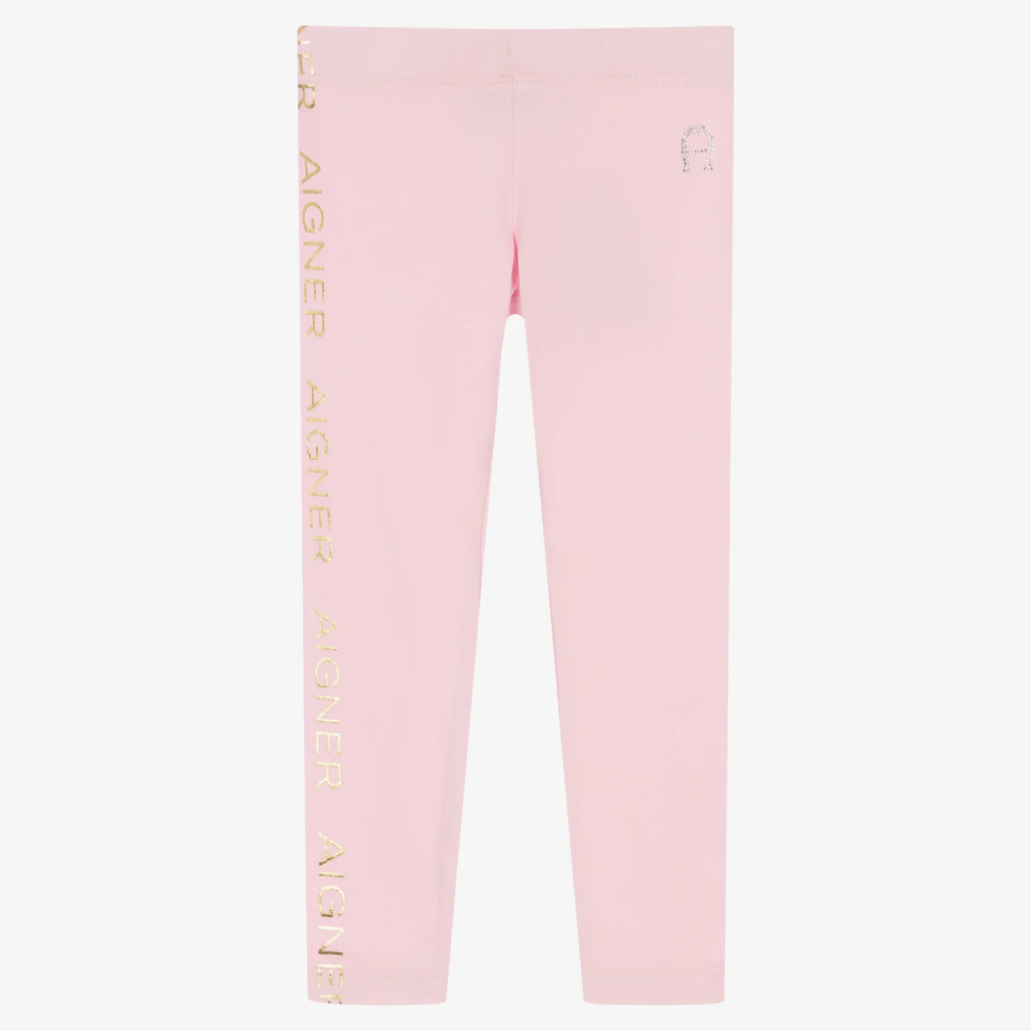 Pink leggings for girls by AIGNER, made in soft and stretchy cotton jersey. They have a repeat gold logo print on one leg and a sparkly diamanté signature ‘A’ horseshoe logo on the hip.