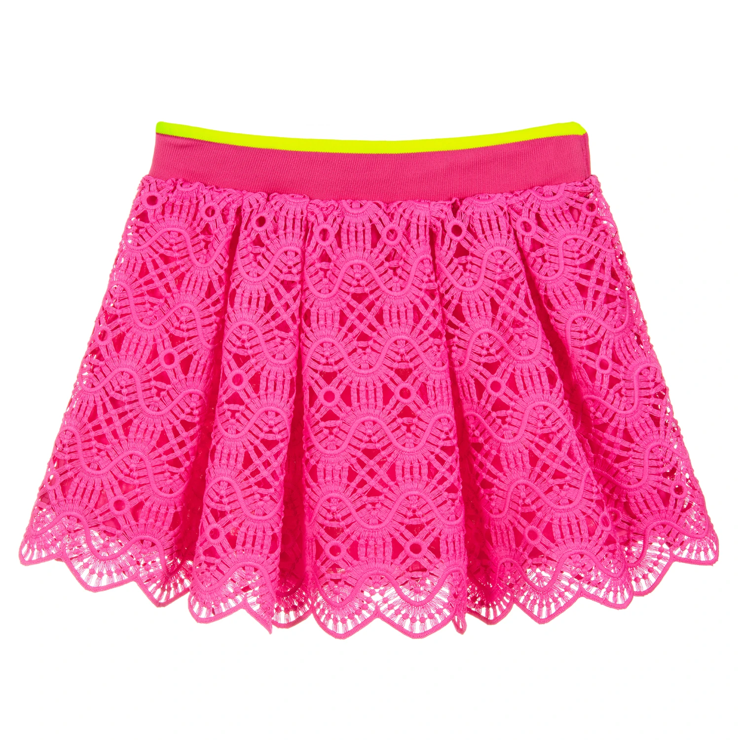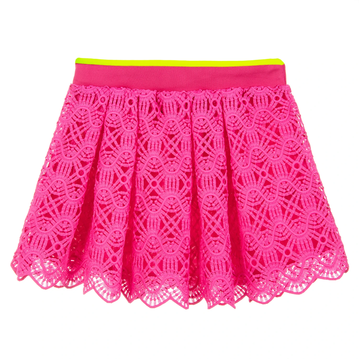 A Mini-me skirt for girls by Alberta Ferretti. This pretty fuchsia pink skirt is made from soft lace and has a lightweight cotton lining. The waistband is soft and stretchy with a navy blue trim.