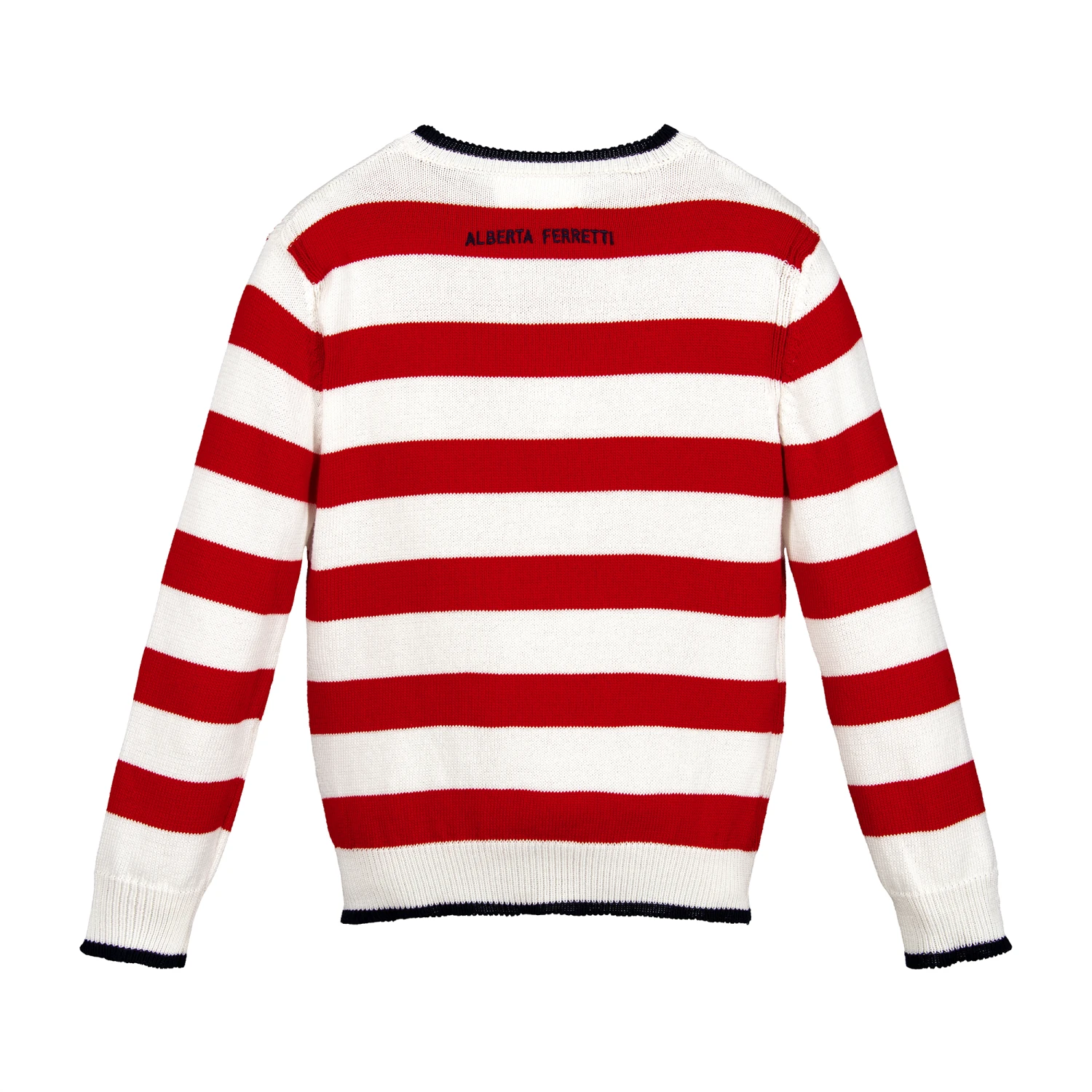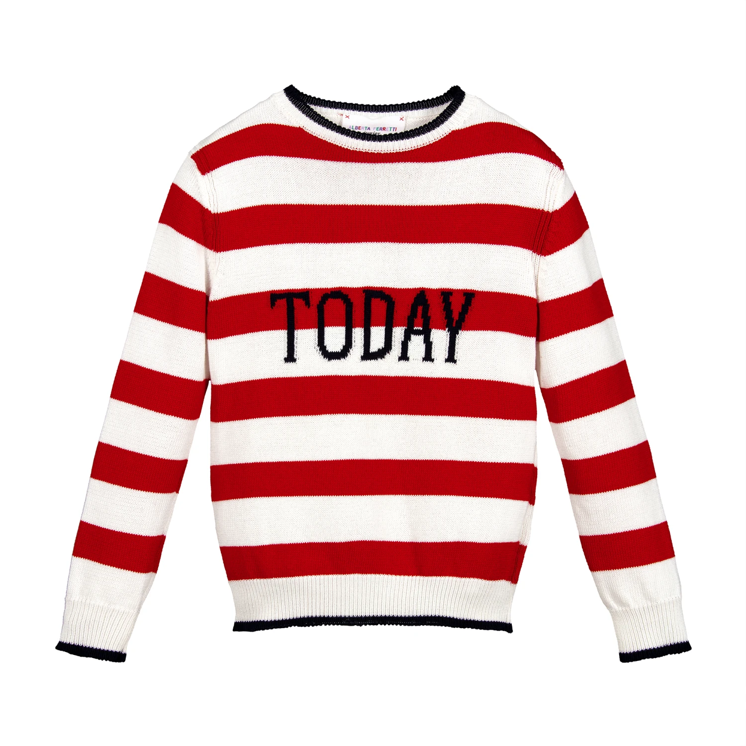 A red and white striped cotton sweater by Alberta Ferretti, directly inspired by the adult line. This soft, cotton knit jumper has navy blue trims and a dark navy blue ‘Today’ motif, knitted on the front.