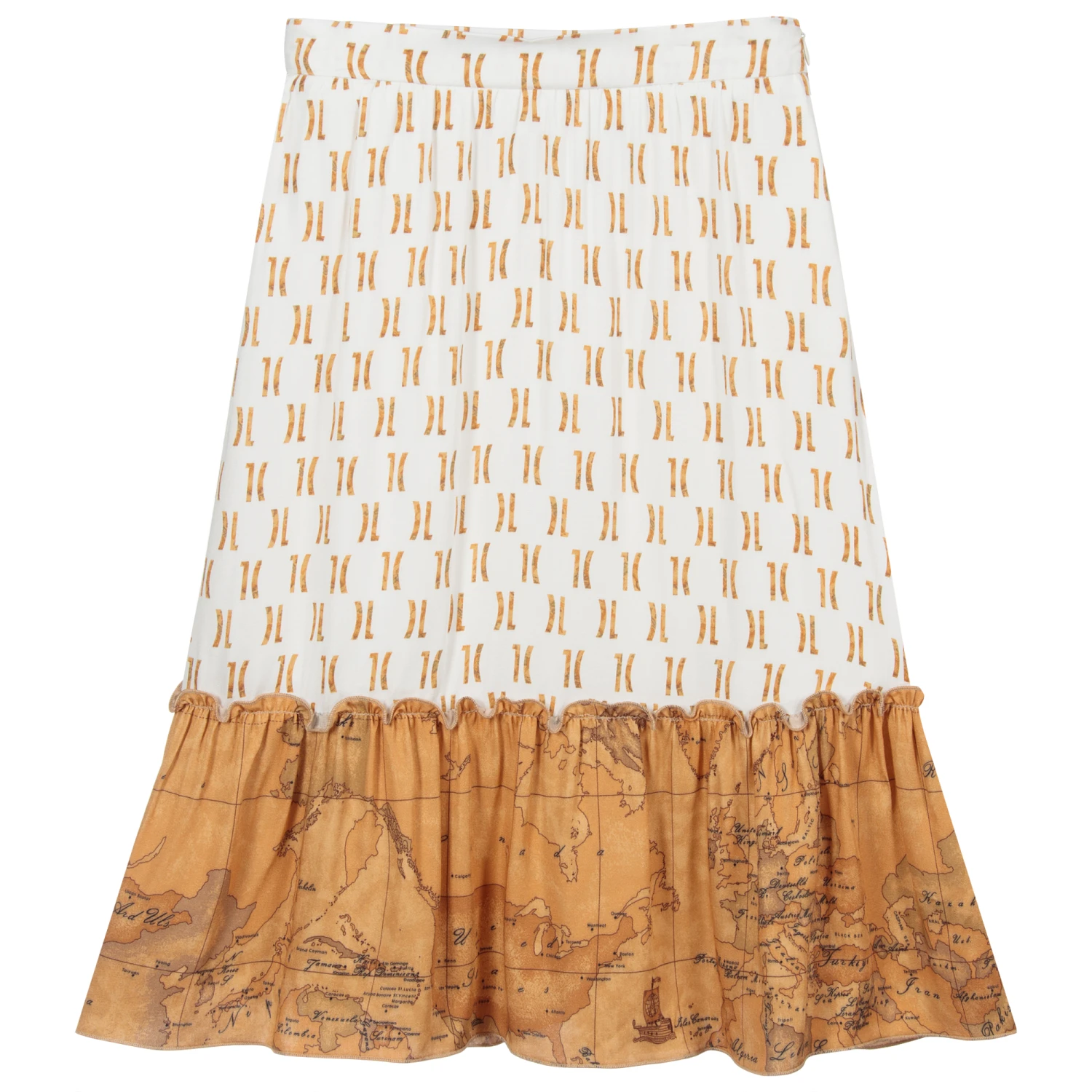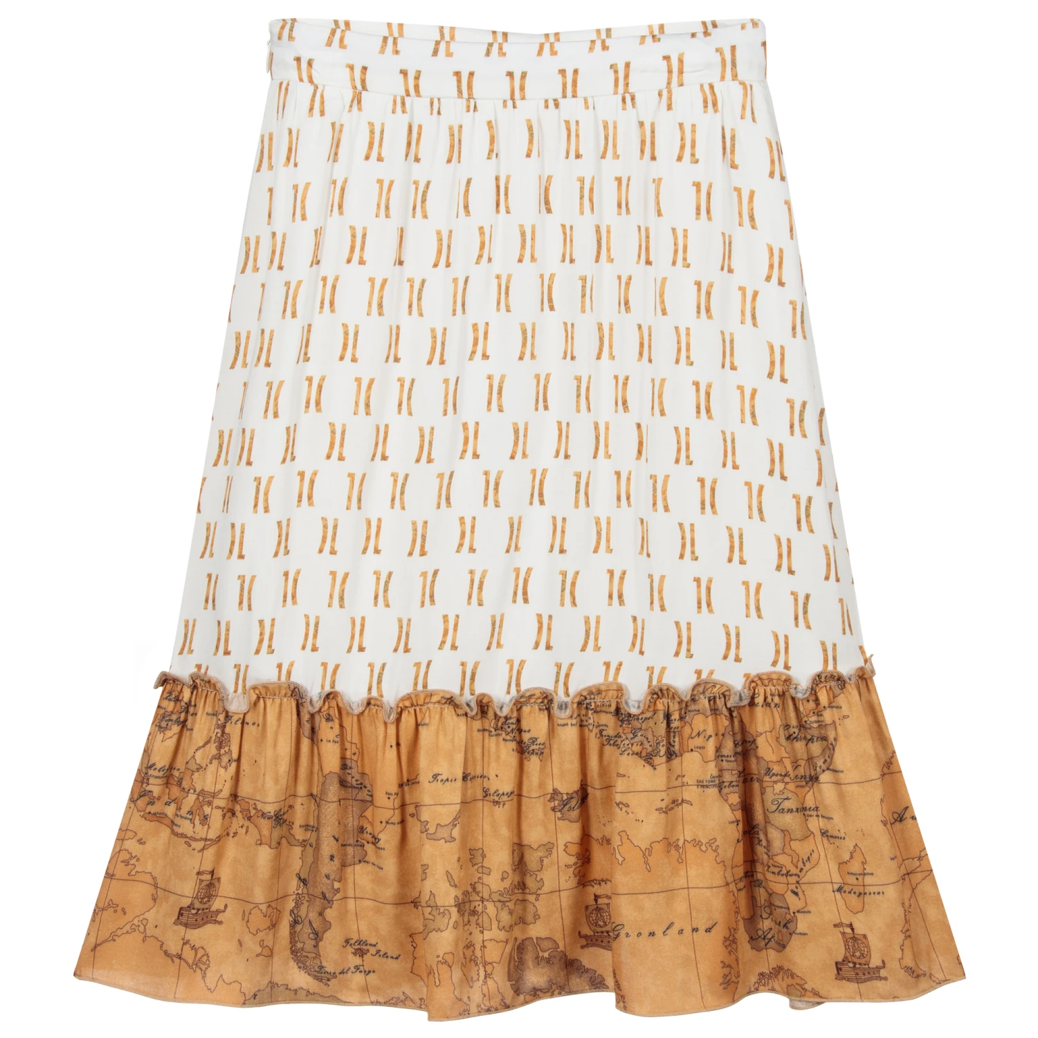 Stylish for girls, a long viscose skirt by Alviero Martini, with the brands signature Geo Map and 1a Classe logo print. Fully lined for added comfort, this Ivory and dark beige skirt has a useful adjustable waistband, with side zip fastening.