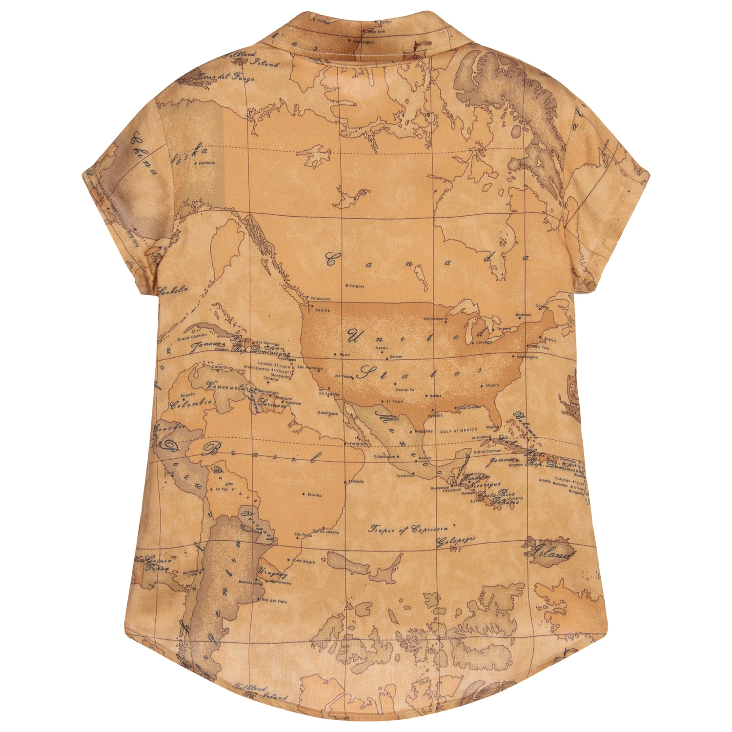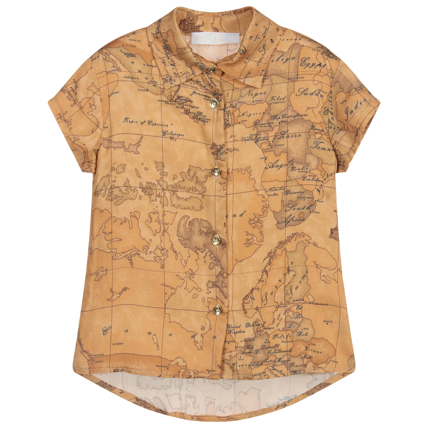Dark beige Geo map print blouse for girls by Alviero Martini. Made in soft, lightweight viscose, it has gold stud detailing on the collar and button fastenings on the front.