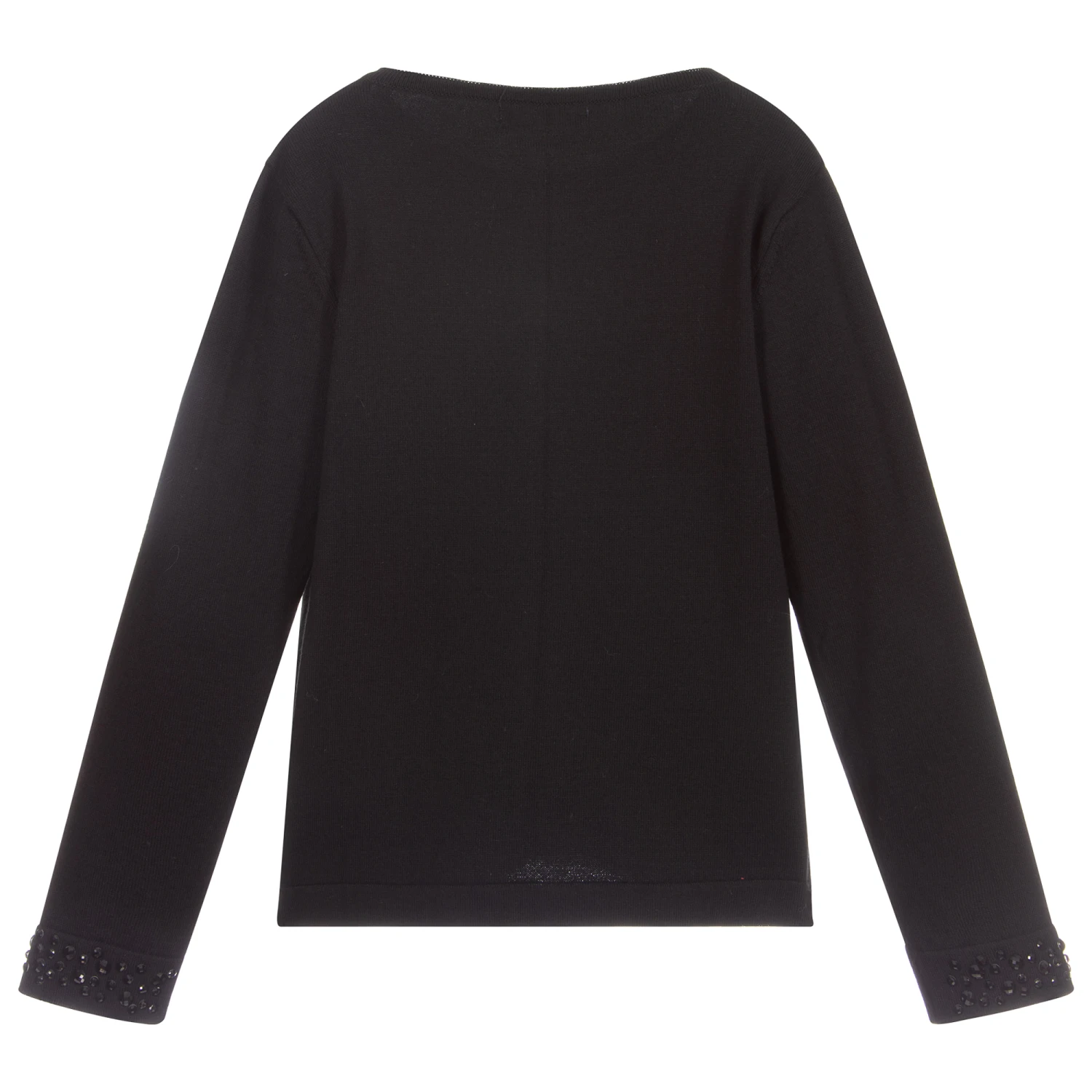 Black cardigan for girls by Alviero Martini, knitted in soft cotton. It has black sparkly bead trim on the cuffs and a dark beige Geo map 1a Classe raised logo on the chest.