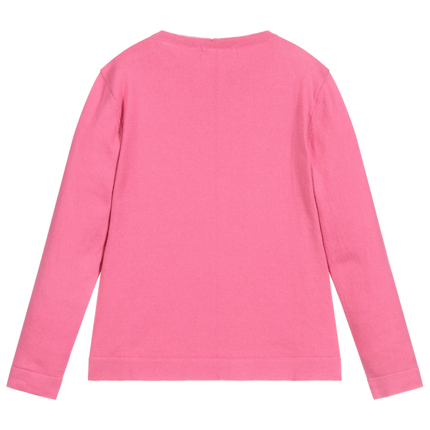 Younger girls pink cotton knit sweater by Alviero Martini. It has the 1a Classe in sparkly gold studs on the front.