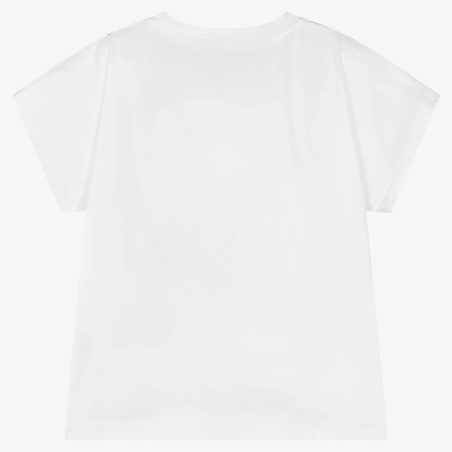 White T-shirt for girls by luxury Italian brand Alviero Martini. On the front, one side of the top is printed with the designer’s distinctive light beige Geo map print, whilst the other side is printed with repeat 1a Classe logos in pink and purple. Soft and comfortable, the top is made in stretchy cotton jersey.