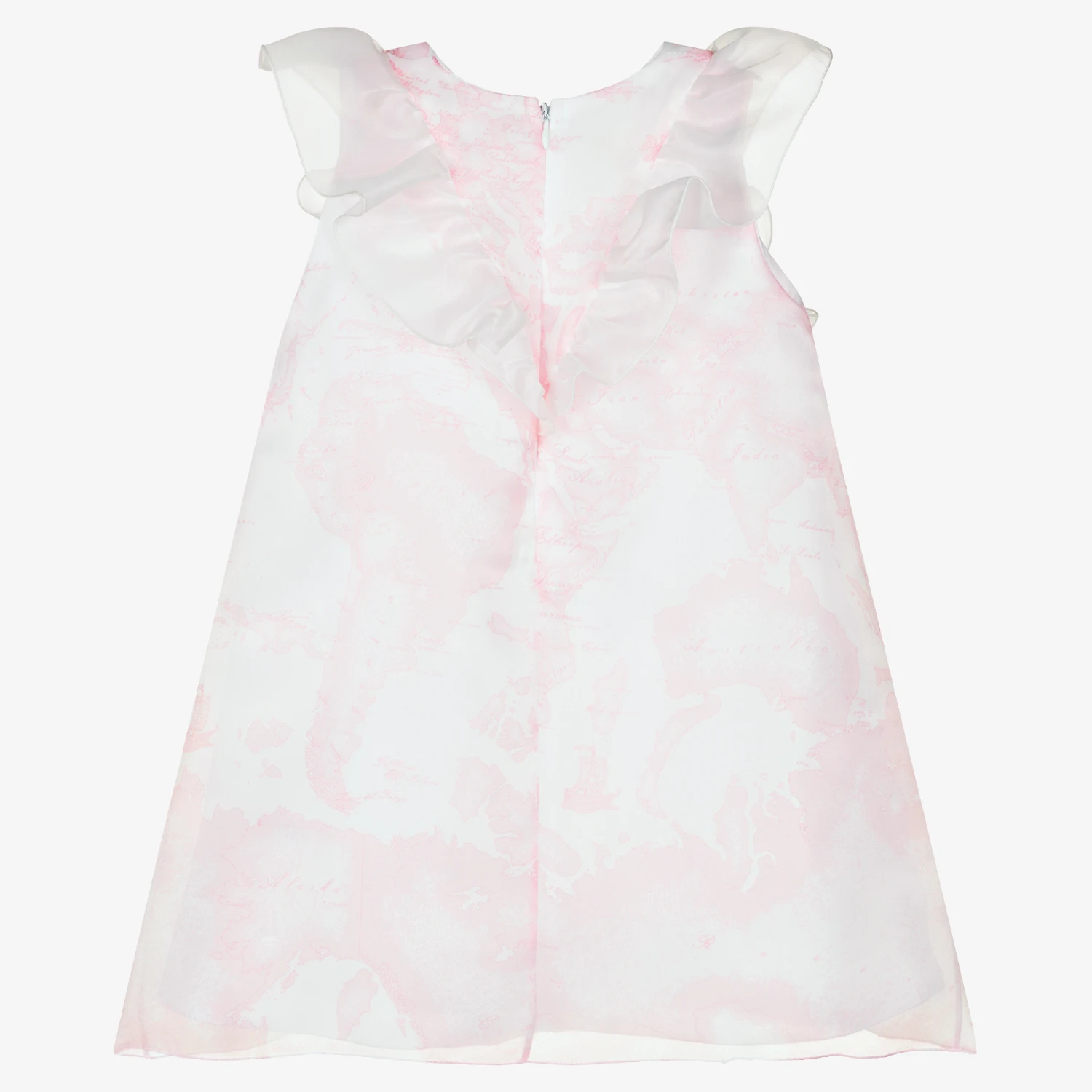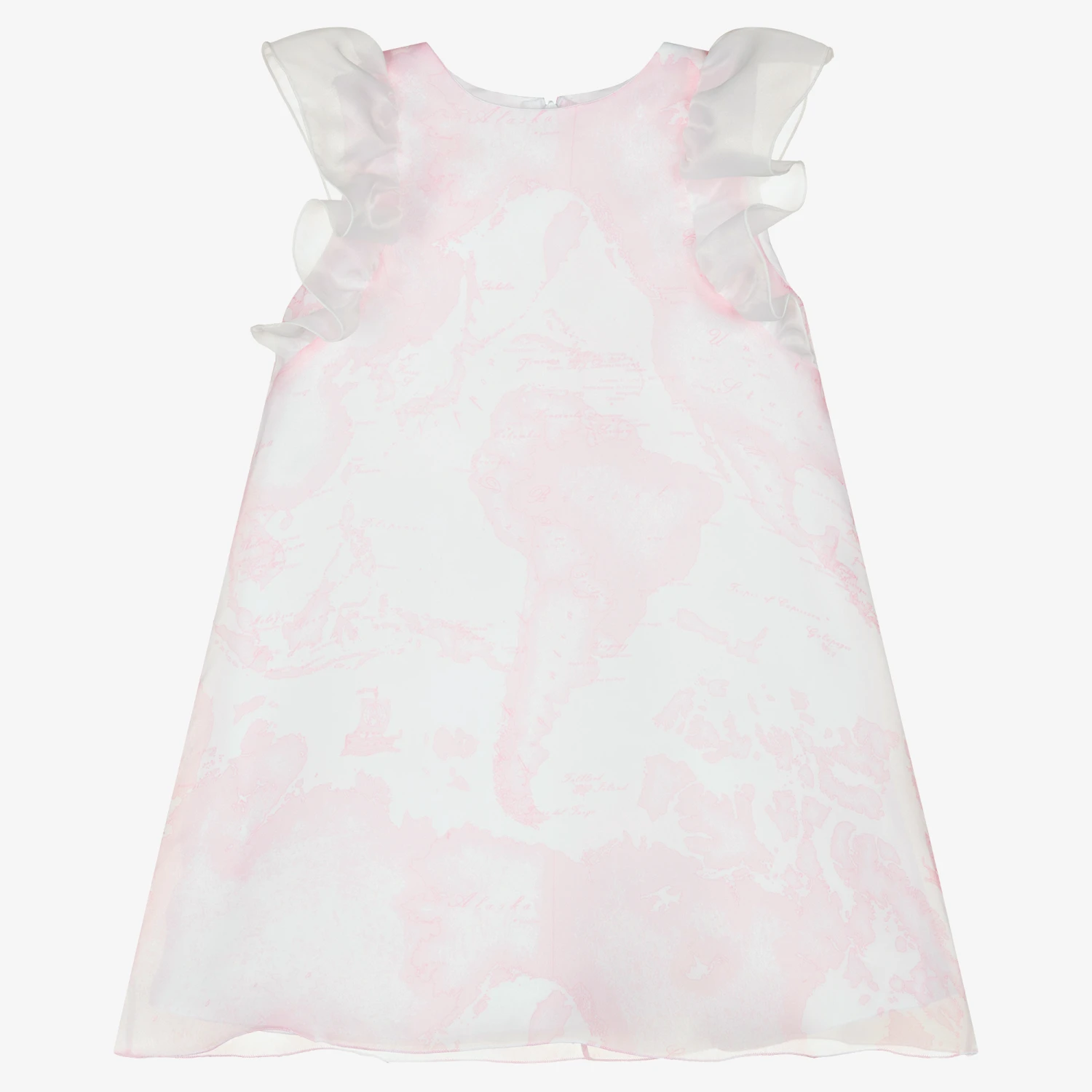 Featuring the designer’s distinctive pink Geo map print, this gorgeous special occasion dress for girls is by luxury Italian brand Alviero Martini. Beautifully made in sheer and lightweight organza, it has feminine ruffles over the shoulders and is lined in lightweight cotton for comfort. There is a concealed zip fastening on the back for a smart finish.