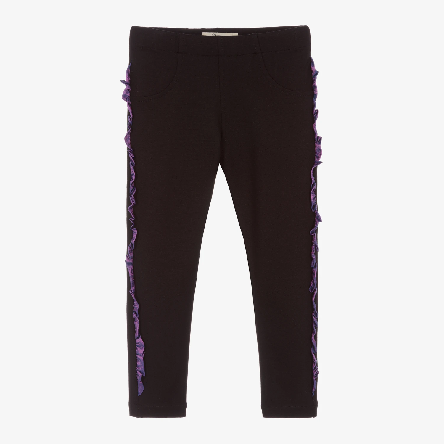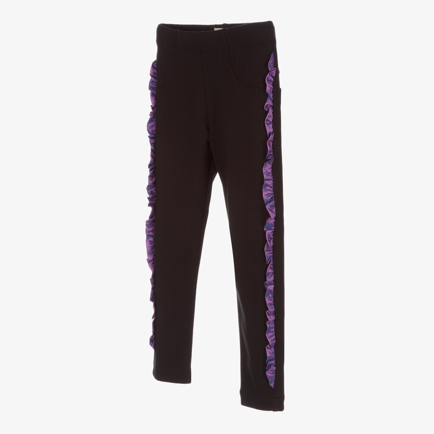 Black leggings for girls by Andorine, made in soft and comfy viscose jersey. They have ruffle trims down the sides, in eye-catching iridescent purple. The waistband is gently elasticated and there are functioning pockets on the back.