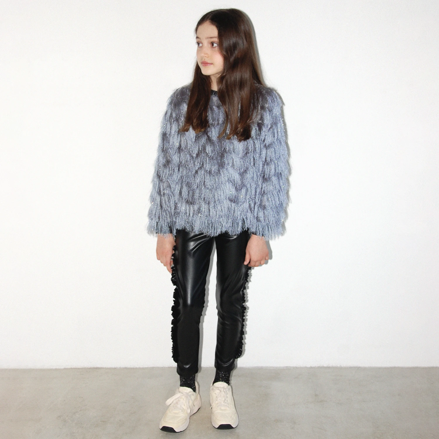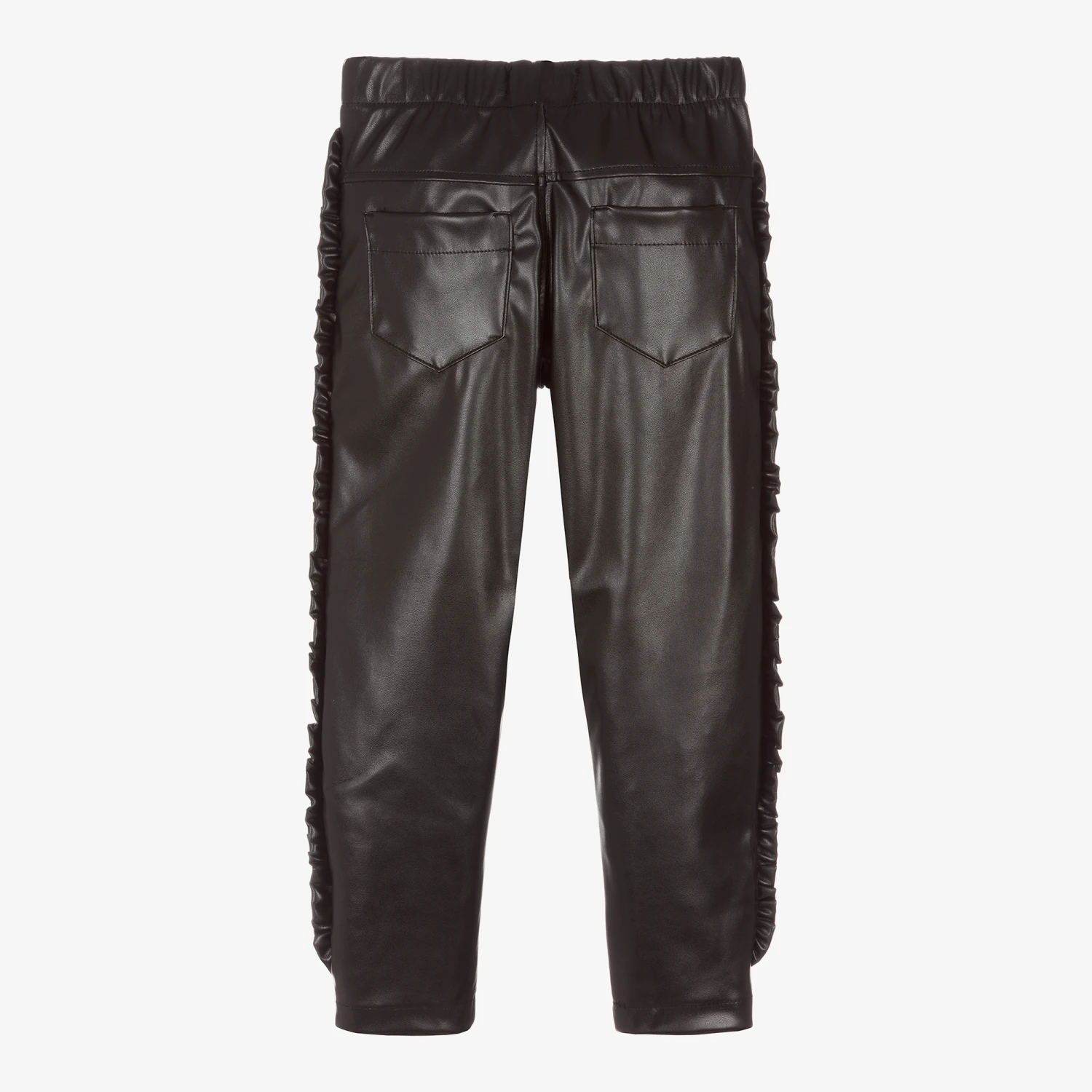 Super cool black leggings for girls by Andorine, made in smooth faux leather. They have feminine ruffle trims down the sides, with faux pockets on the front and functioning pockets on the back. The waistband is comfortably elasticated for a good fit.