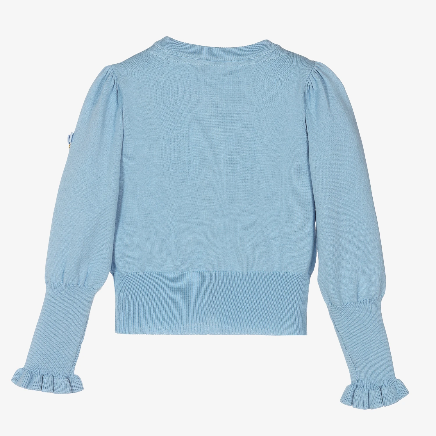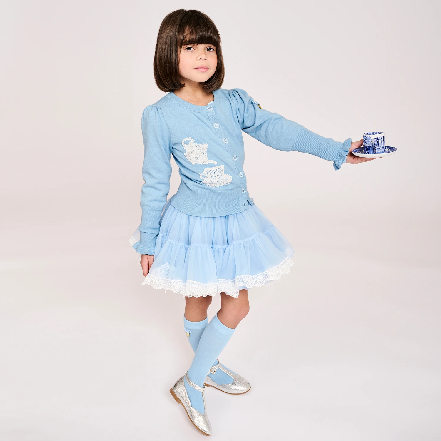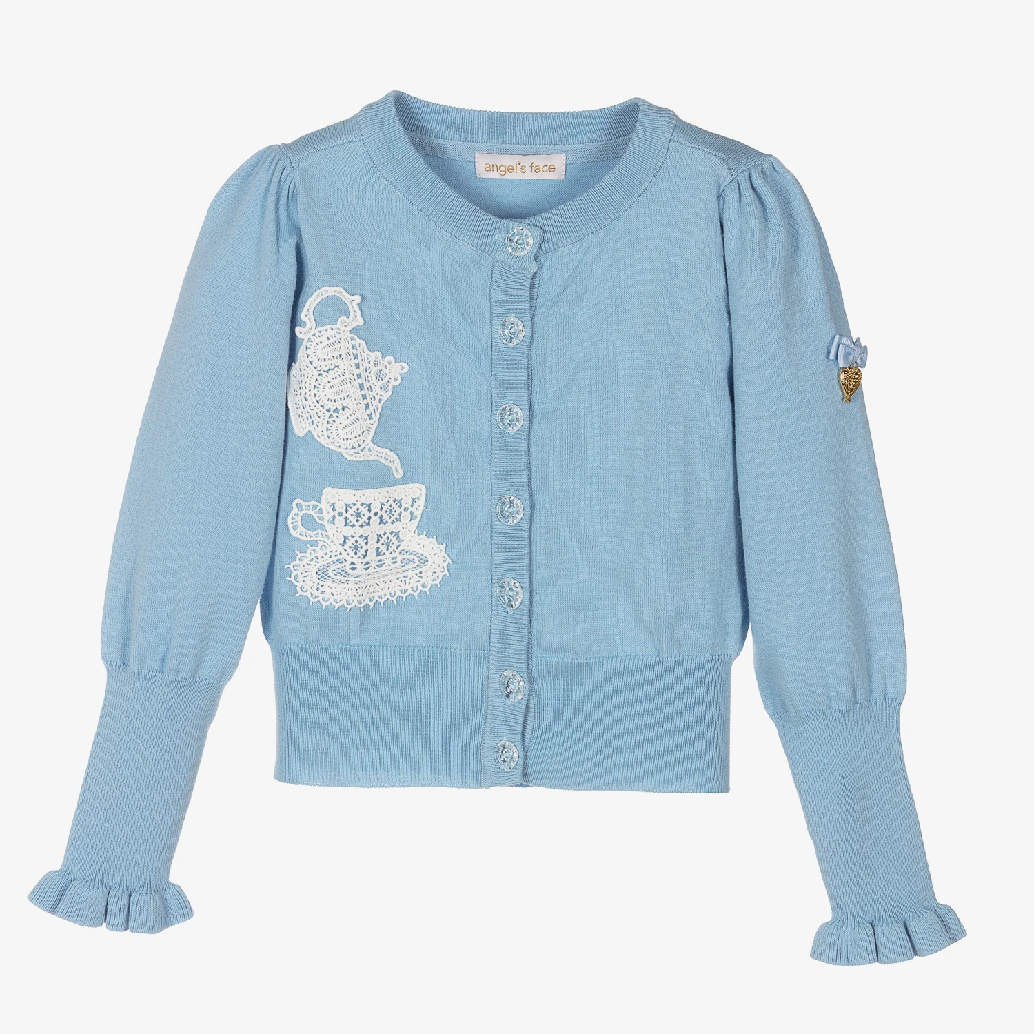 Pretty pale blue cardigan for girls by British brand Angel’s Face. Knitted in a fine cotton blend, it has lovely ivory lace teapot and teacup appliqués on one side. The stylish puffed sleeves have long cuffs with frilled trims and the brand’s signature heart charm and bow on one sleeve. It fastens with transparent buttons on the front.