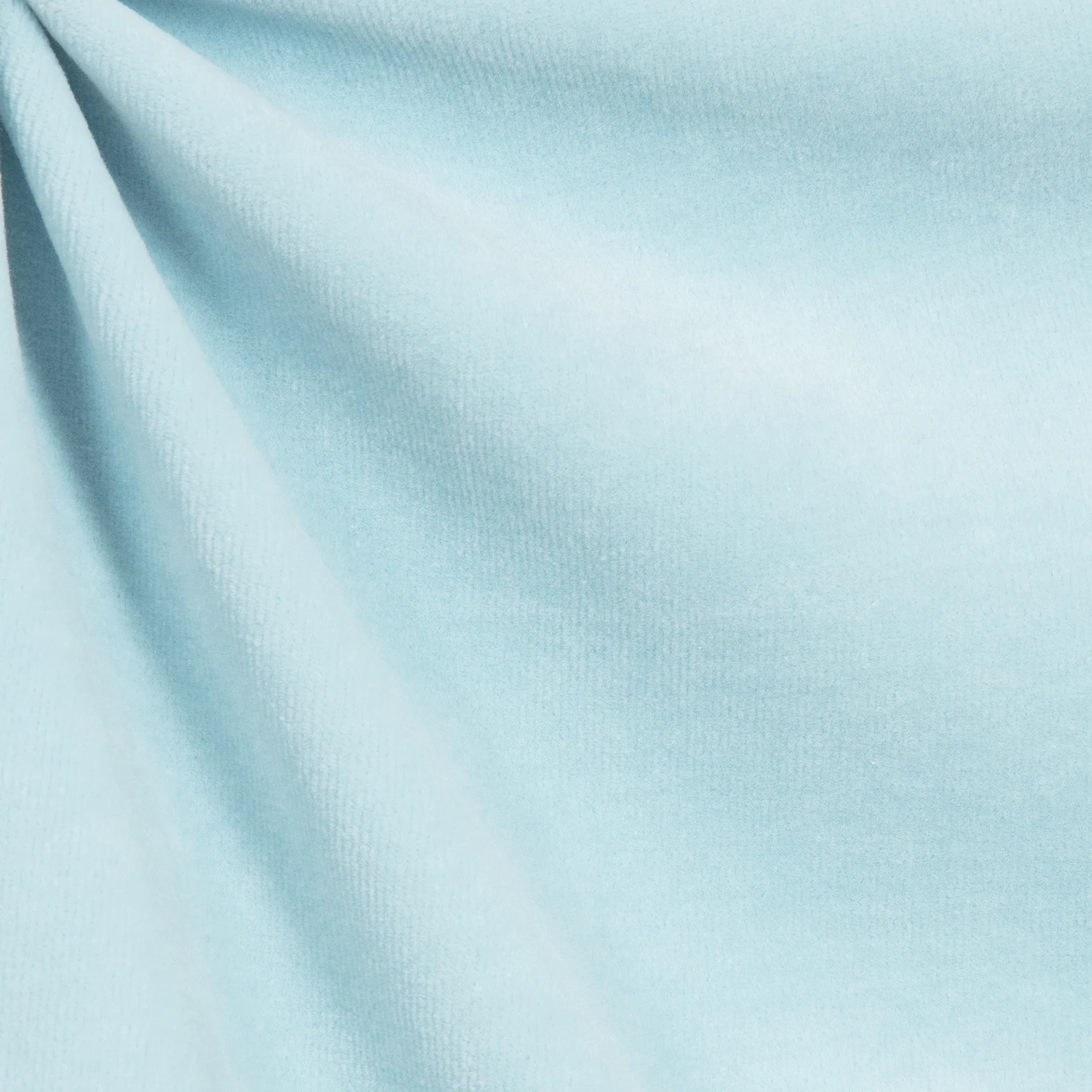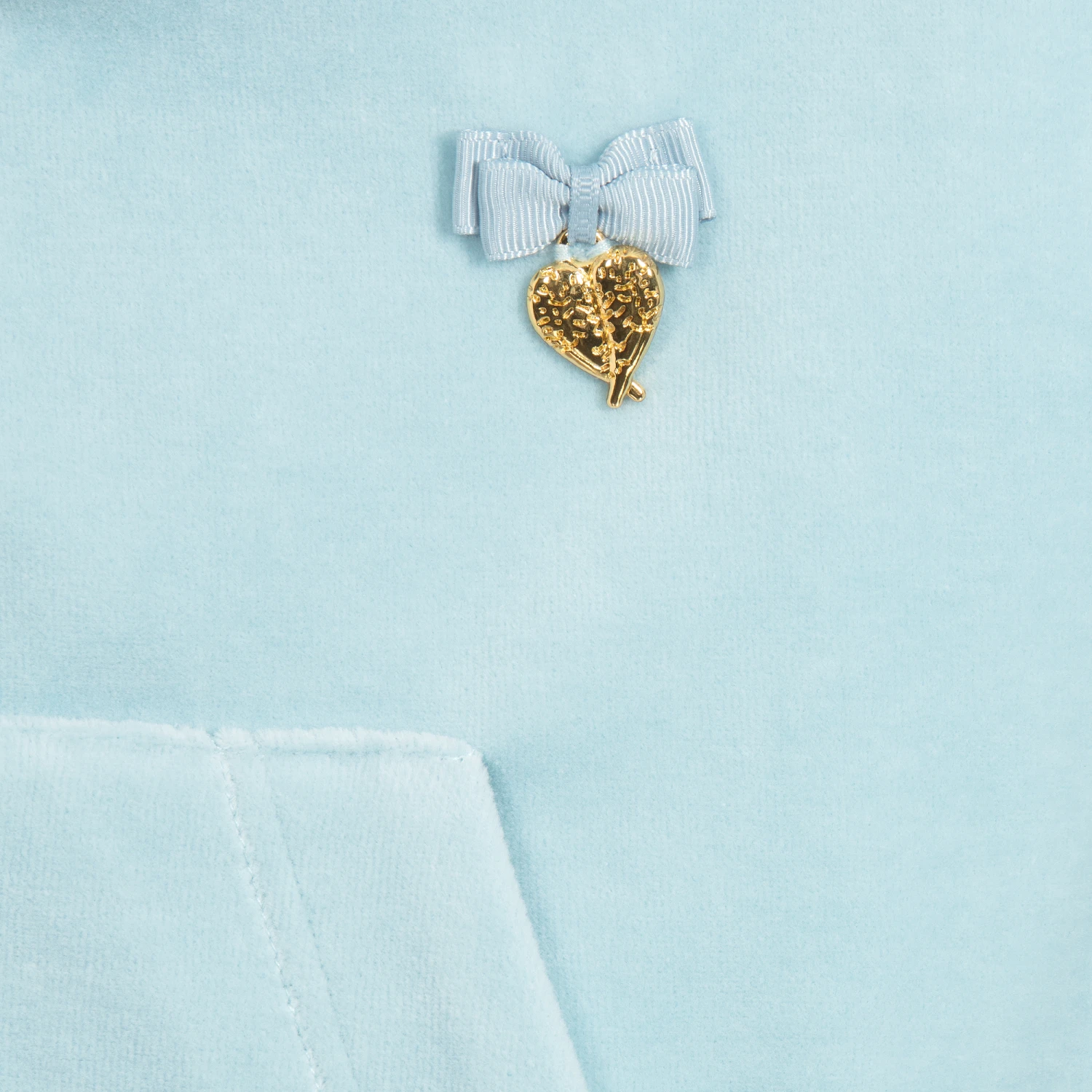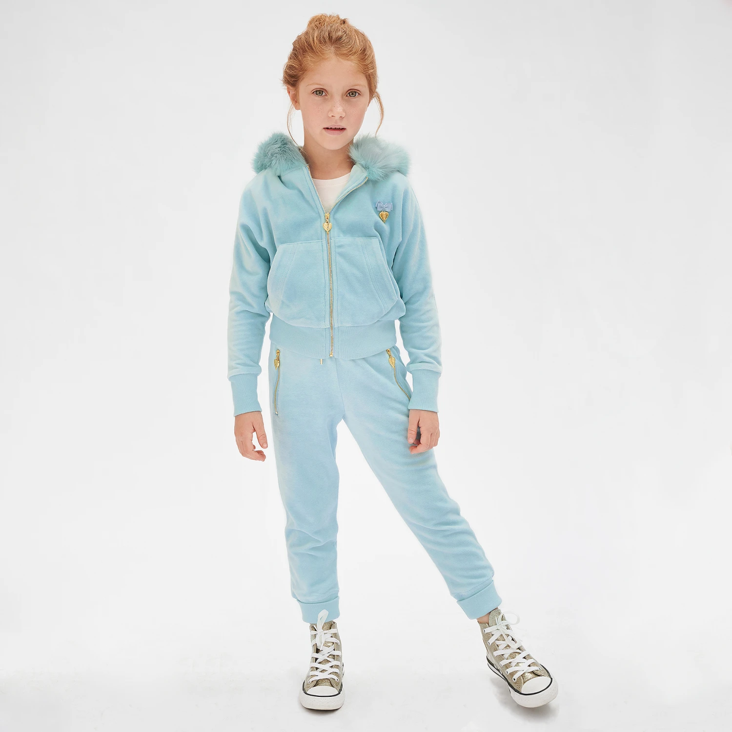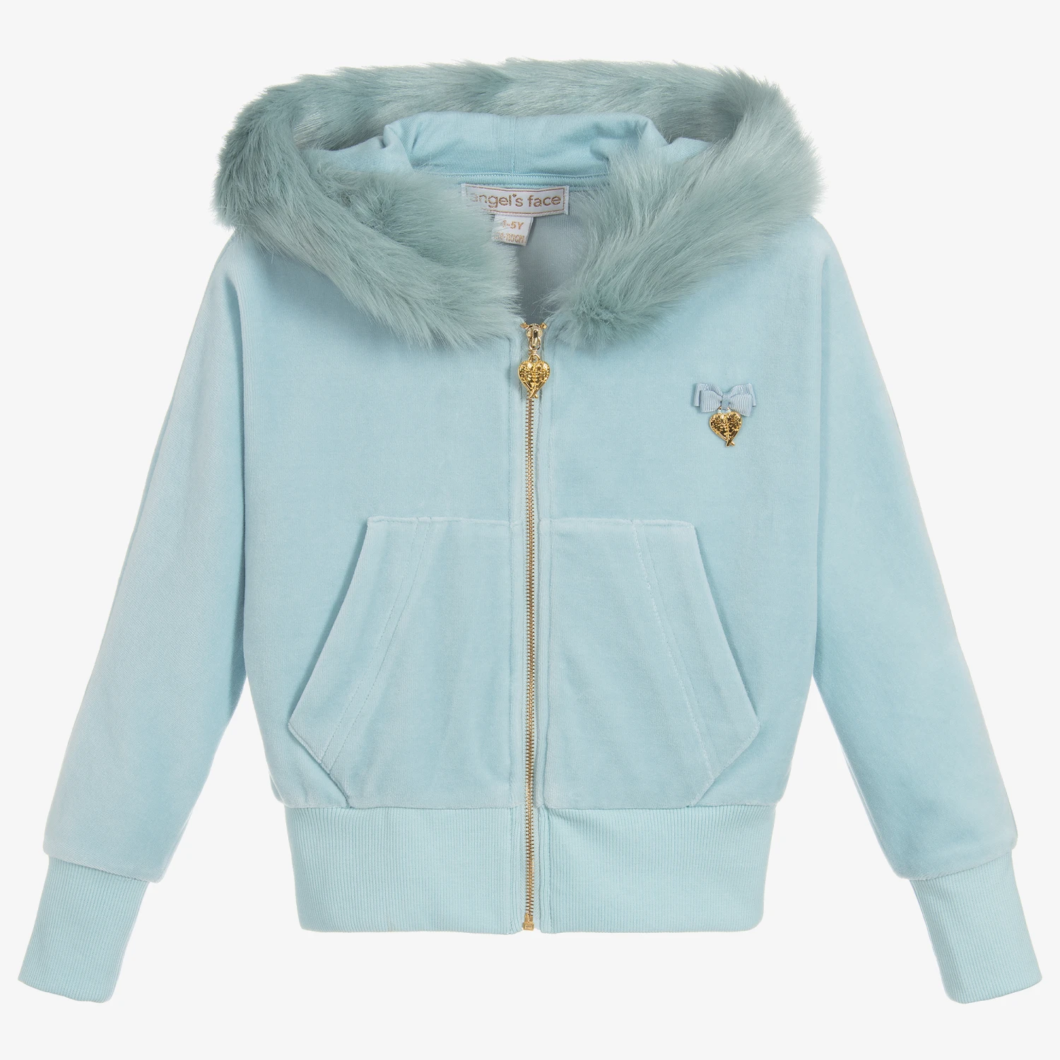 Girls duck egg blue top by Angel’s Face, made from soft cotton velour. It has a faux fur trim and a soft jersey lining. The designer’s gold angel wing heart logo is on the chest and zip pull.