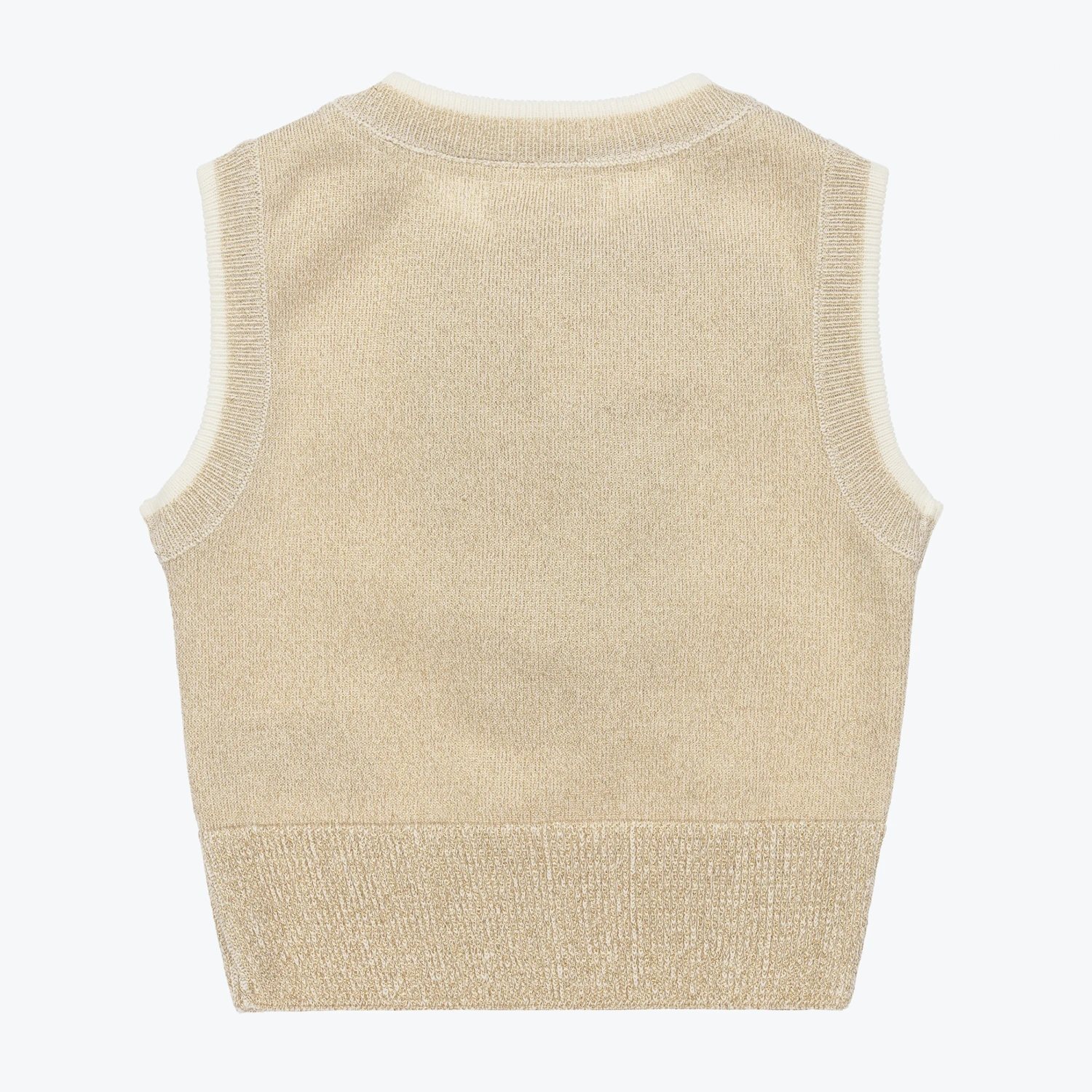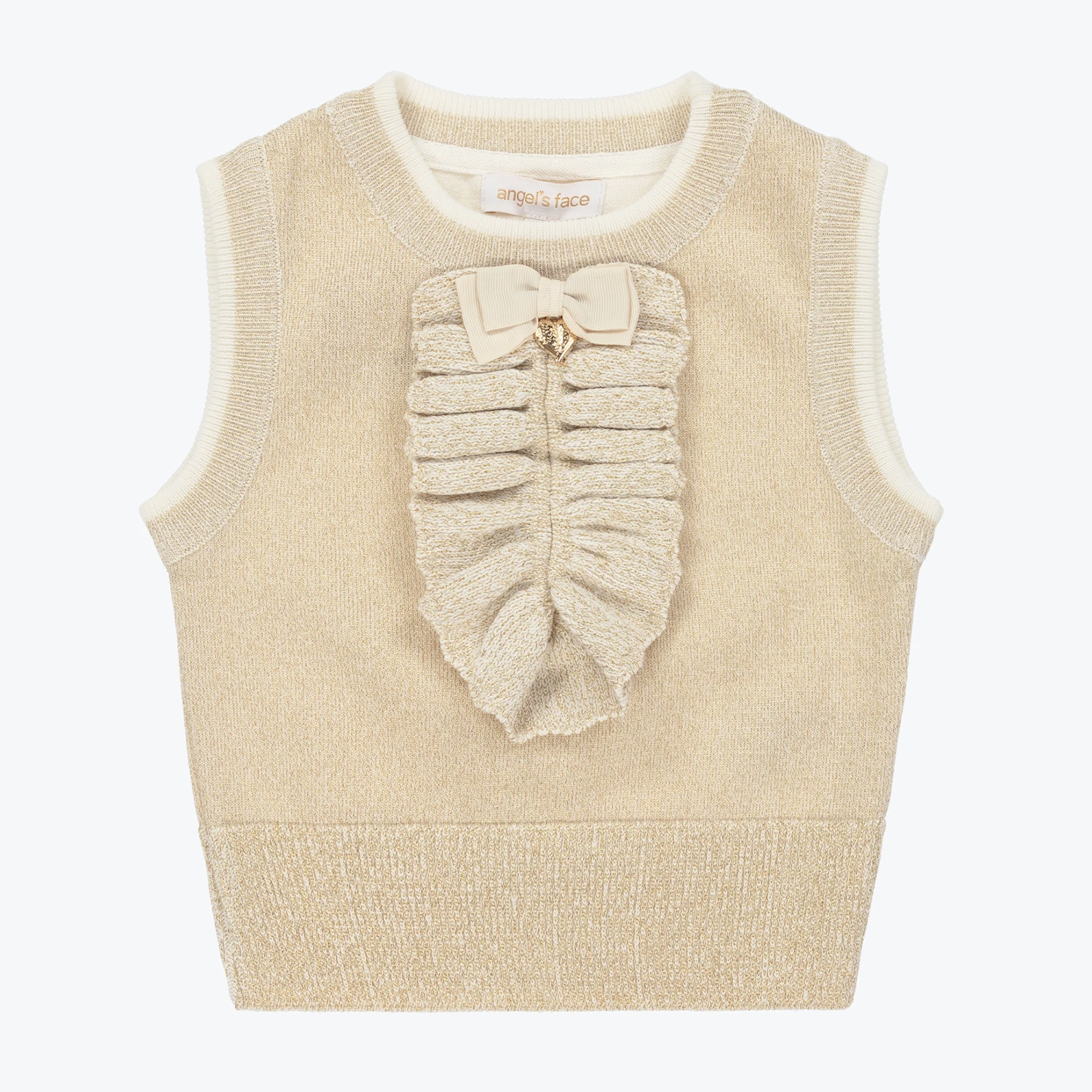 A shimmery ivory and gold sleeveless top for girls by Angel’s face. It is beautifully knitted in soft cotton, with a metallic thread in the knit. There is an eye-catching knitted ruffle on the front, trimmed with the brand’s signature golden angel wings charm and grosgrain ribbon bow.