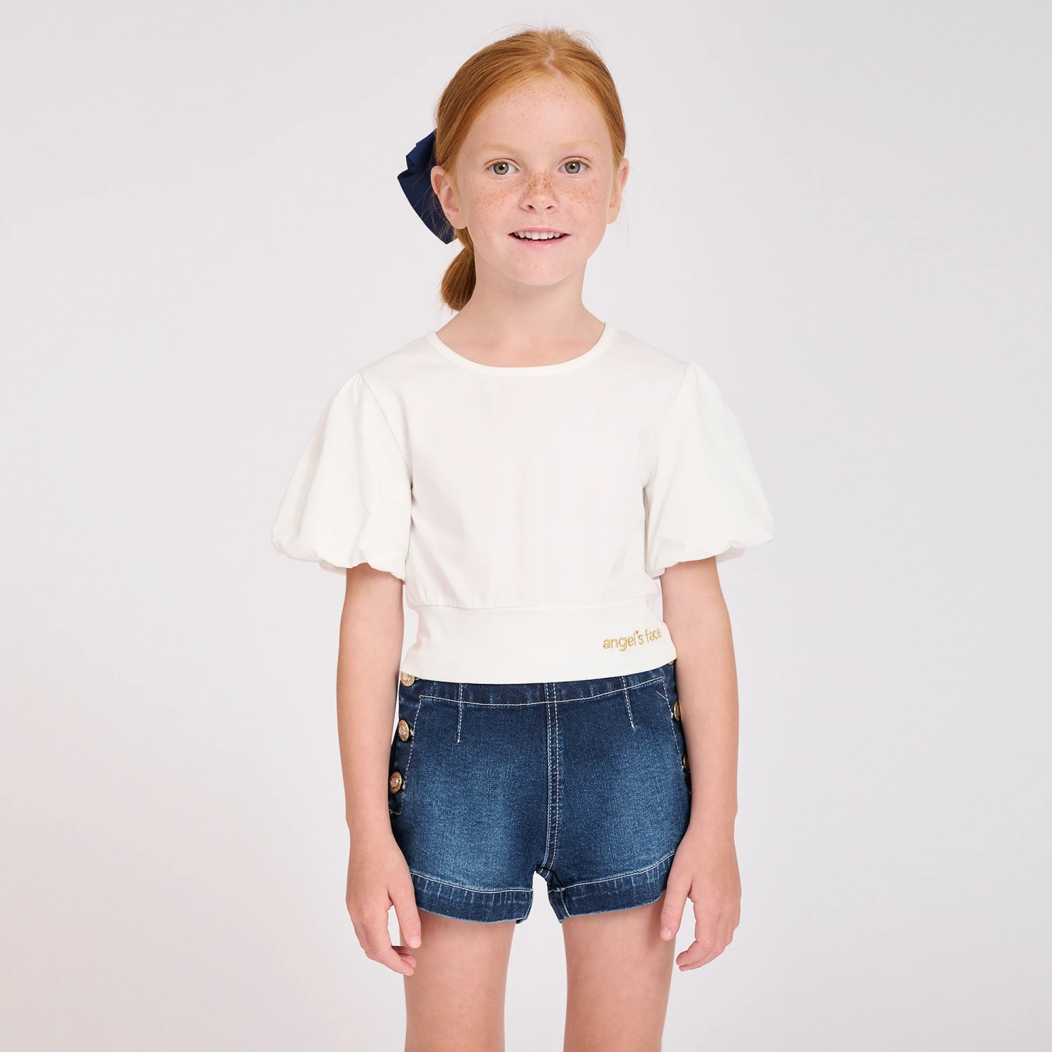Girls indigo blue denim shorts by British brand Angel’s Face, made in a soft, stretchy cotton blend. They have a cool washed look on the front and contrast white stitching, inspired by classic denim styling. The sides fasten with glamorous shiny gold buttons, decorated with sparkling silver diamantés and the brand’s logo for added girly sparkle.