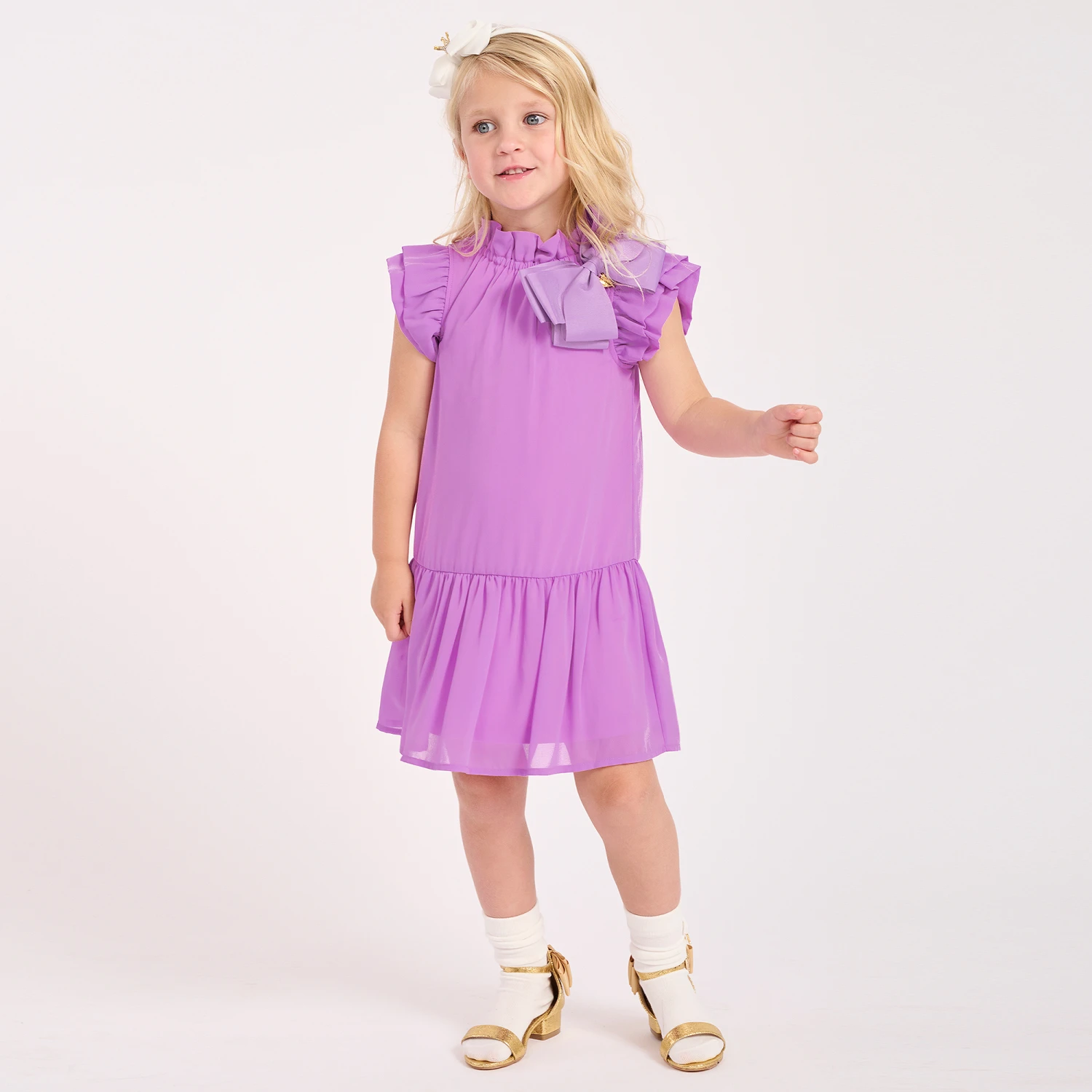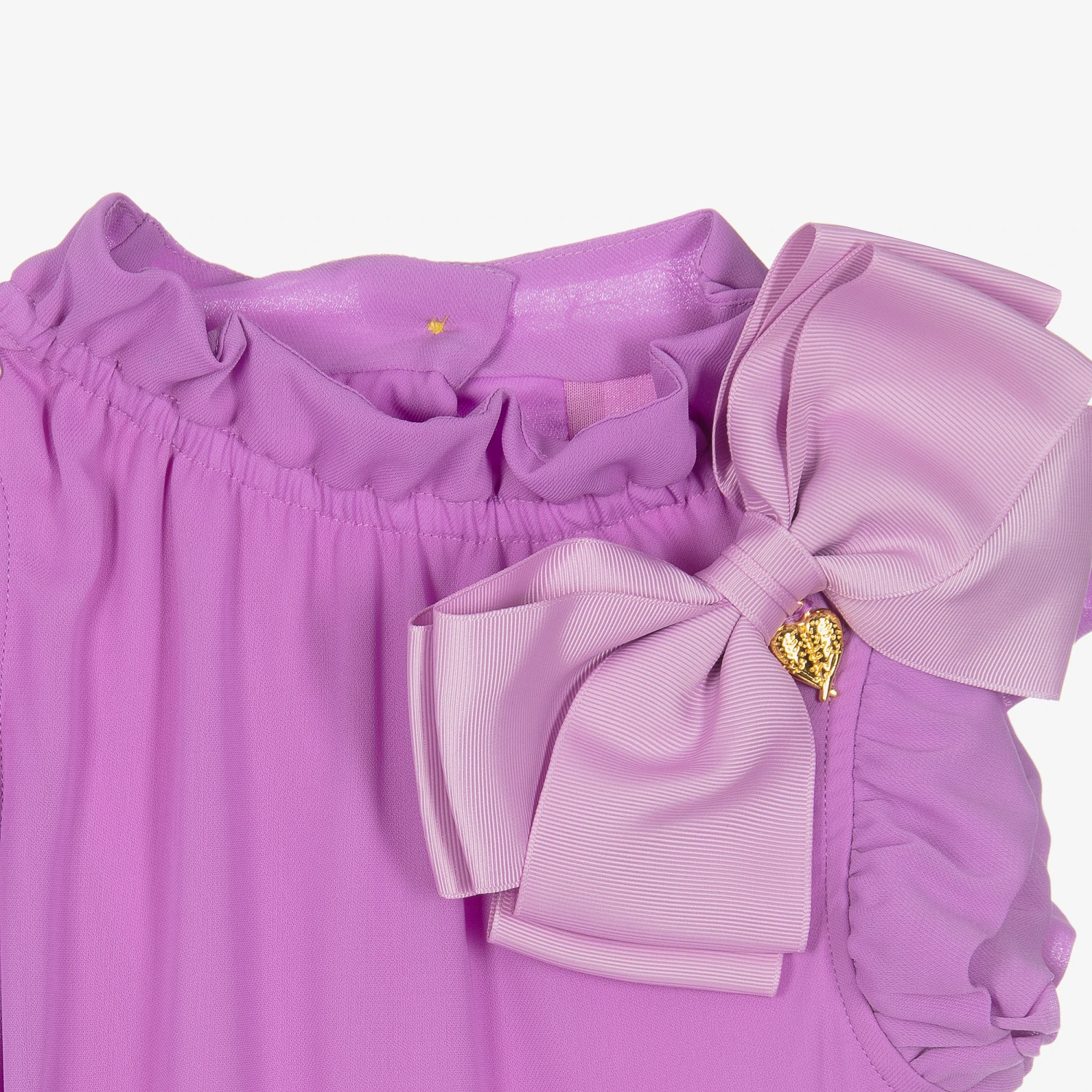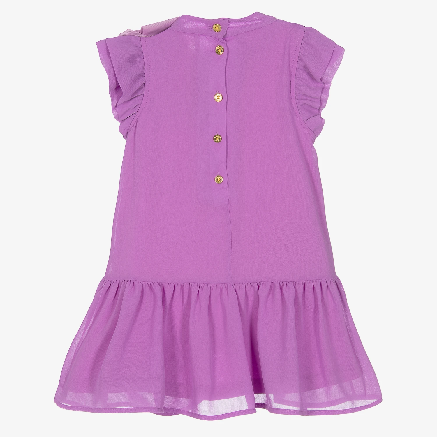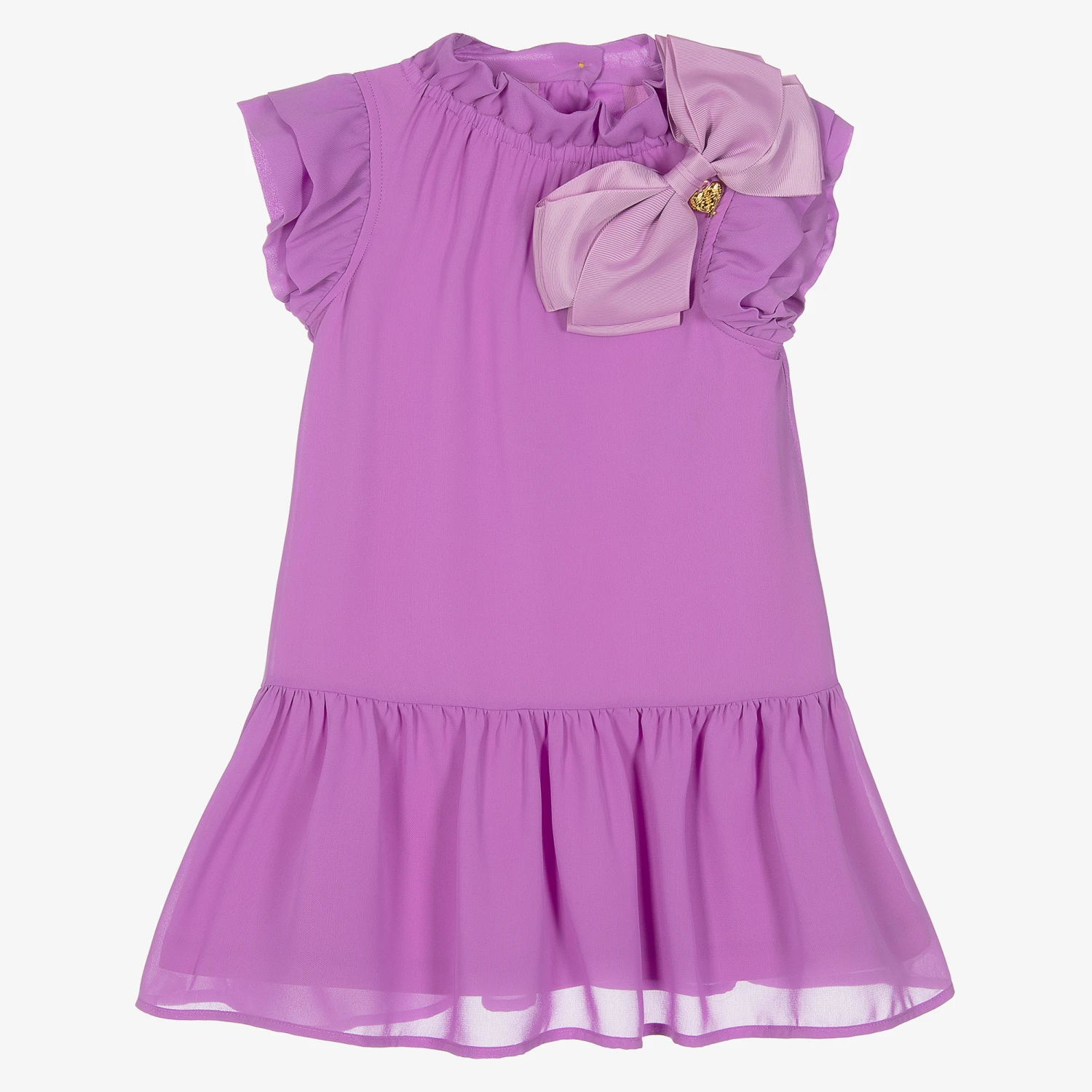 Gorgeous purple dress for girls by Angel’s Face, crafted in beautifully soft chiffon. Trimmed with feminine ruffles, this stunning dress has a statement bow appliqué on the chest featuring the brand’s signature gold heart charm. In a floaty silhouette, it fastens with glamorous gold logo buttons on the back. The lining is made in a luxuriously soft modal jersey blend for stylish comfort.