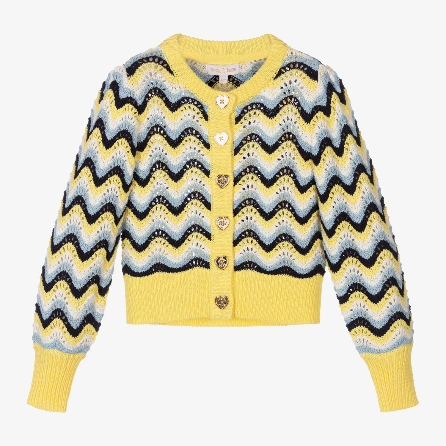 Bright yellow and blue knitted cardigan for girls by Angel’s Face. With a lovely wavy pattern, this softly knitted top has ribbed trims and fastens with gold heart-shaped branded buttons on the front.