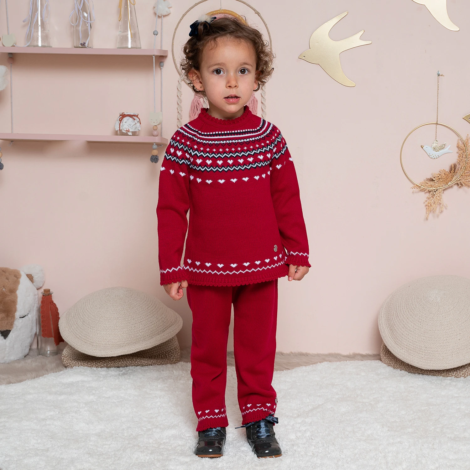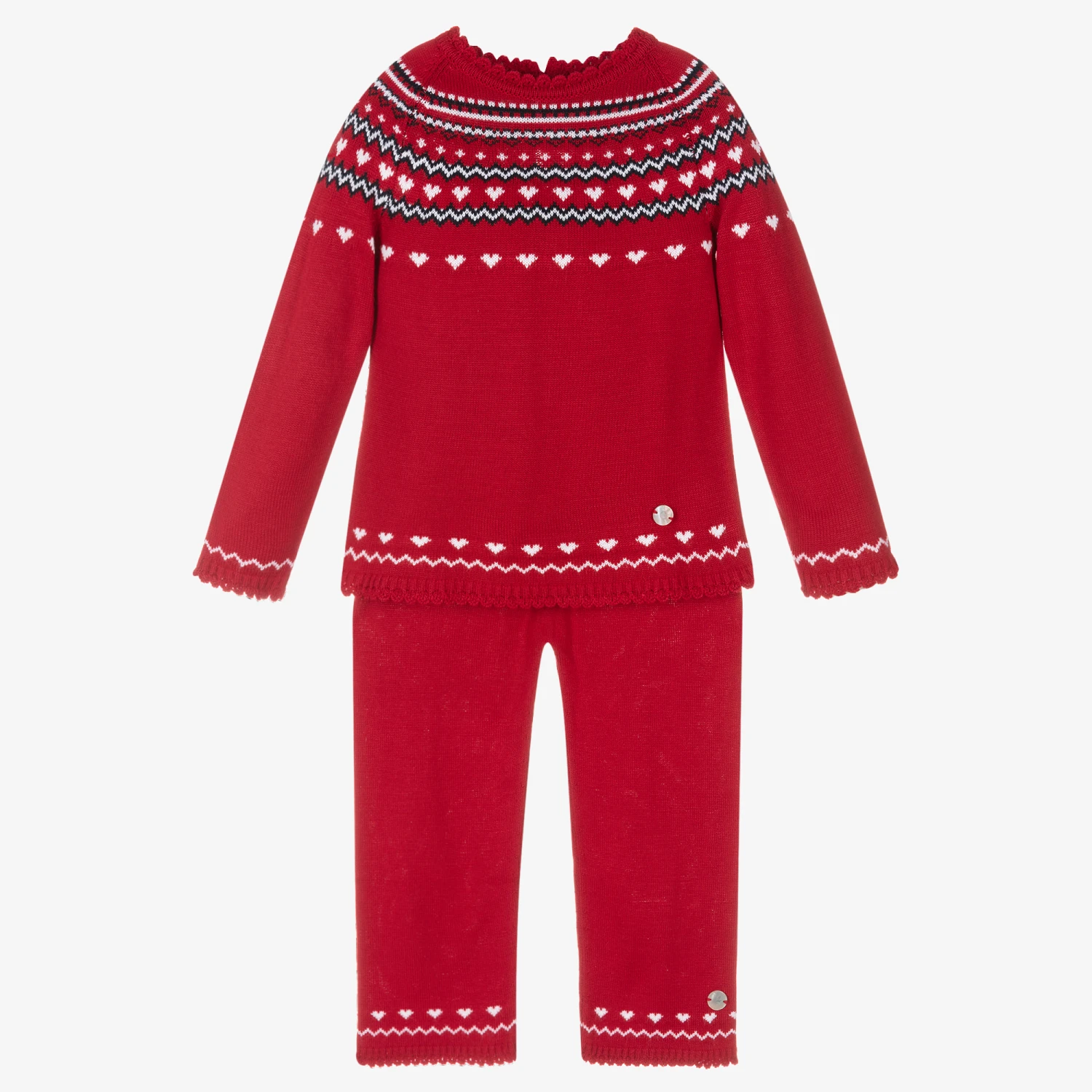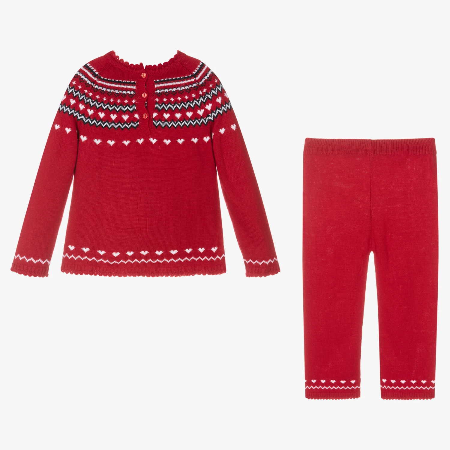 Exclusive to Childrensalon, this cute and comfortable red trouser set for girls is by Spanish brand Artesania Granlei. Knitted in soft acrylic with scalloped trims, the sweater has traditional Fair Isle styling around the shoulders in navy blue and white, with little white hearts. It has a mother-of-pearl logo tab sewn by the hemline and fastens around the back with buttons. It comes with coordinating knitted trousers.