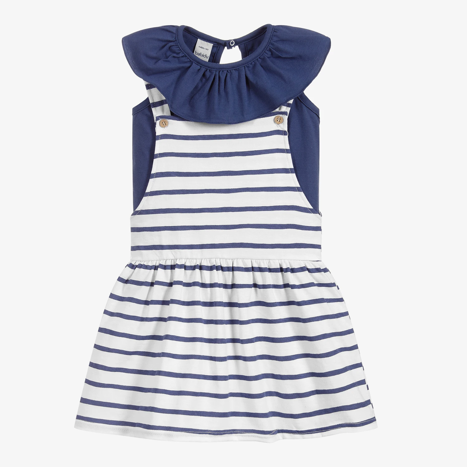 Girls navy blue and white striped pinafore dress set by Babidu, made in comfortable cotton jersey. The dress has wood-effect buttons on the shoulder straps and a gathered skirt. It comes with a navy blue jersey top that has a pretty ruffle collar and a keyhole popper fastening on the back.