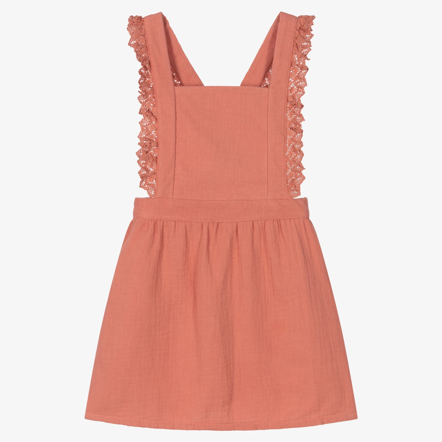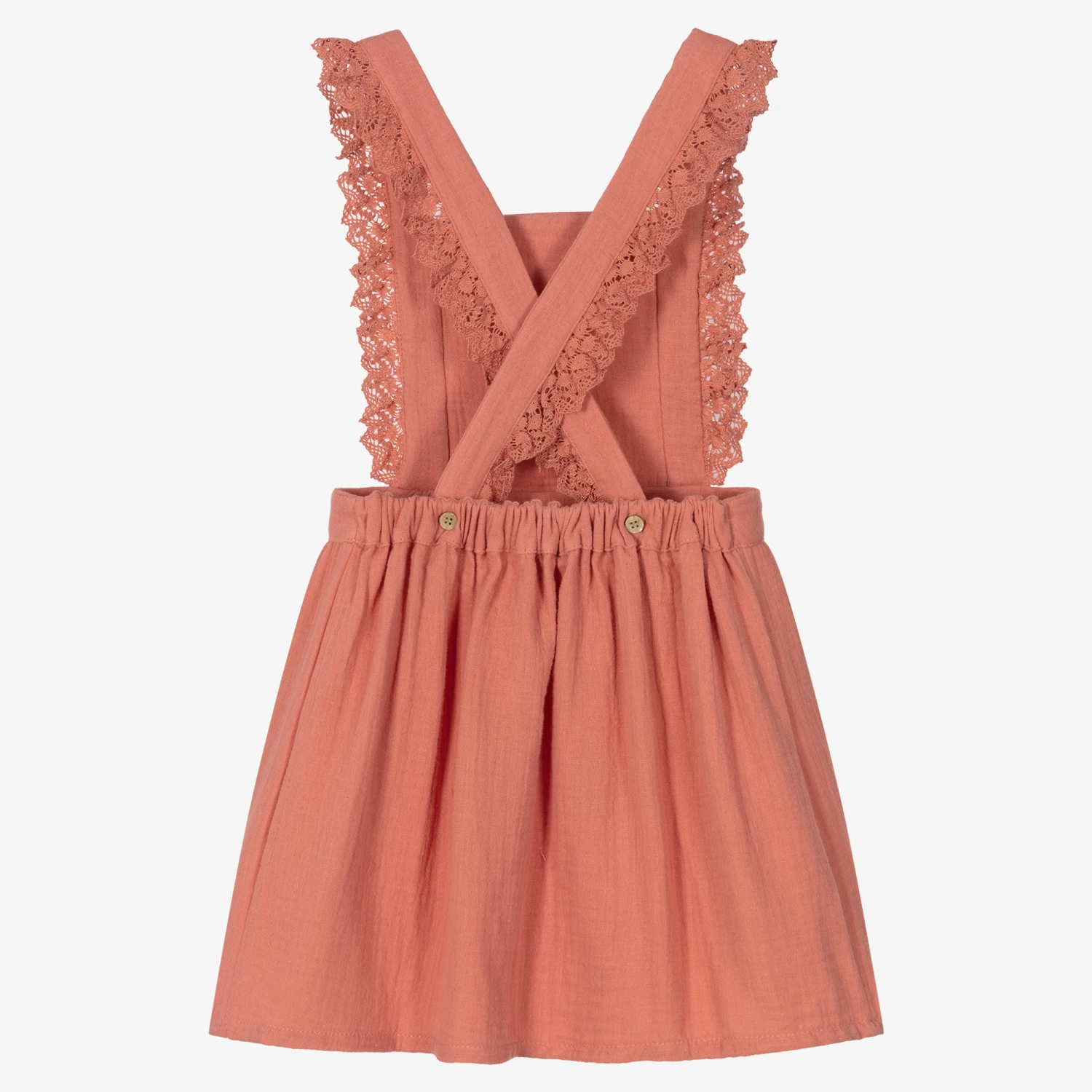 Dainty blush pink pinafore dress for girls by Spanish designer Babidu, made in soft and lightweight cotton. For a feminine, vintage look, the straps are lined in lace and cross over at the back with button fastenings. It has a stretchy waistband to ensure a secure fit.