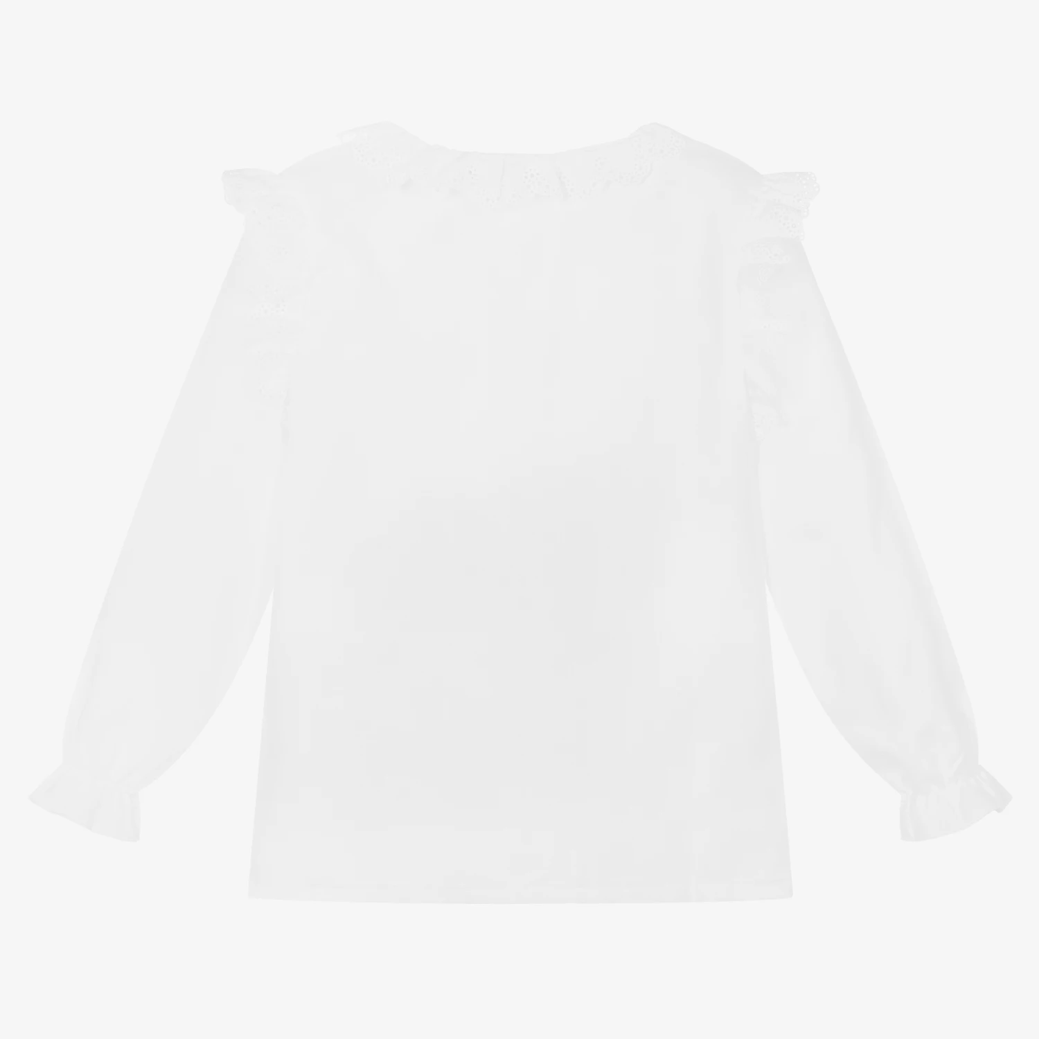 Smart white blouse for girls by Spanish brand Babidu. Made in cotton twill and classic in style, it has cotton voile frilled trims, edged in pretty cutwork. It fastens with buttons on the front and has gently elasticated cuffs.