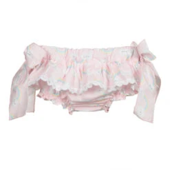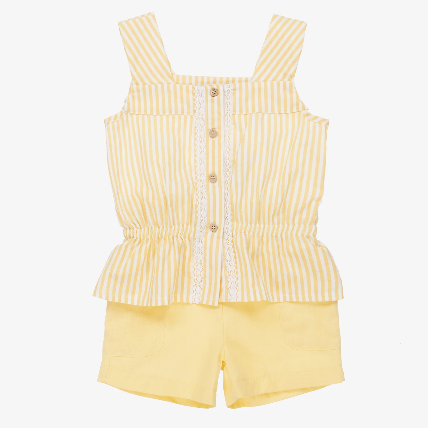 Yellow top and shorts set for girls by Spanish brand Babidu, exclusive to Childrensalon. The white striped top is made in lightweight cotton with button fastenings on the front, an elasticated waist and pretty lace trim. The cotton and linen blend shorts have a partially elasticated waistband for easy pull on, and large patch pockets at the sides.