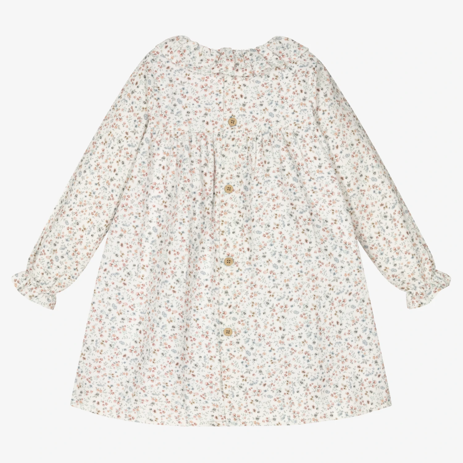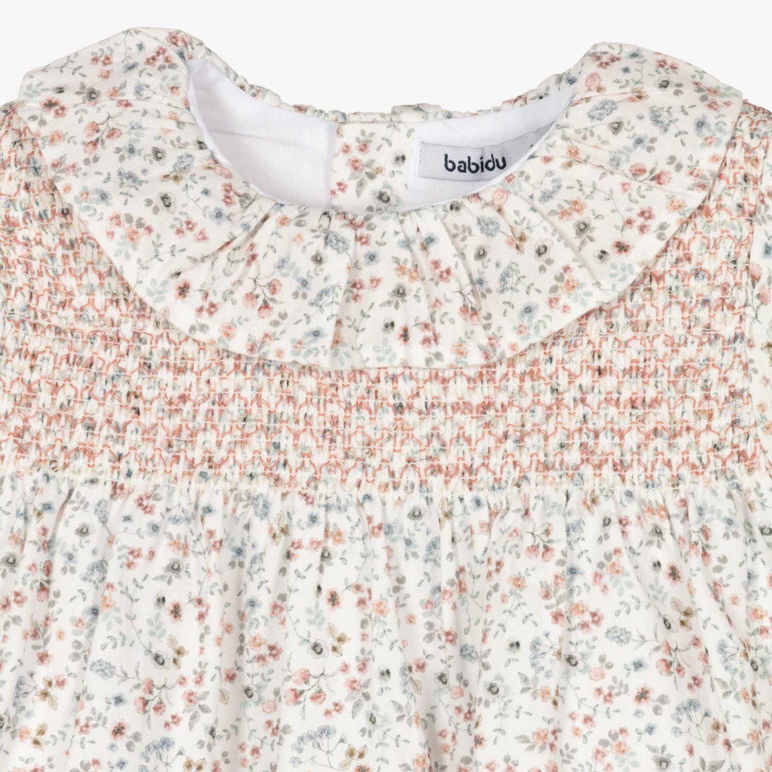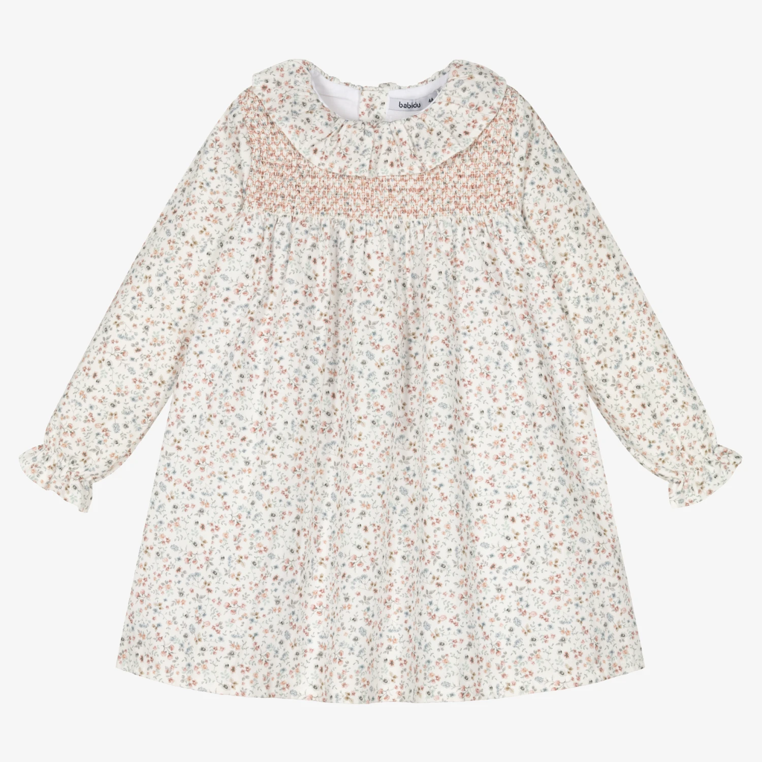 Ivory with a pretty pink and blue floral print, this traditionally styled dress for girls is by Babidu. It has a sweet ruffle collar and beautiful smocking detail on the bodice for a timeless classic look. Ever so comfortable to wear, it is woven in soft cotton twill and has gently elasticated cuff. There is a lightweight cotton lining, with wooden button fastenings on the back.