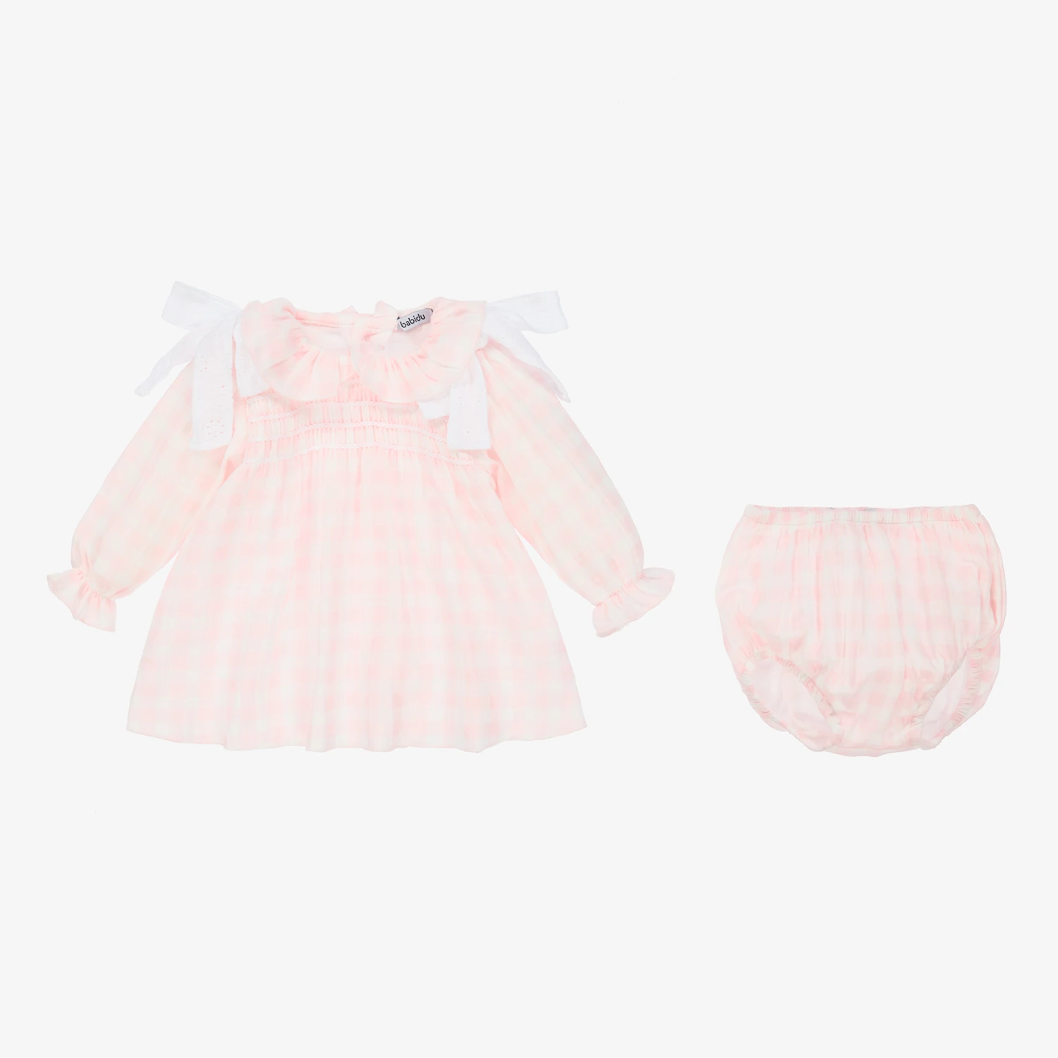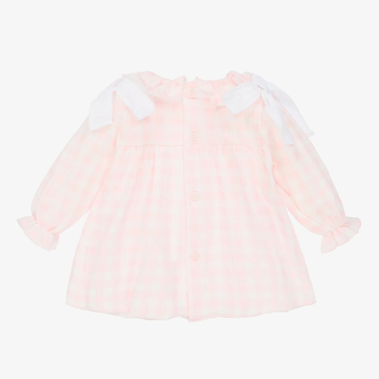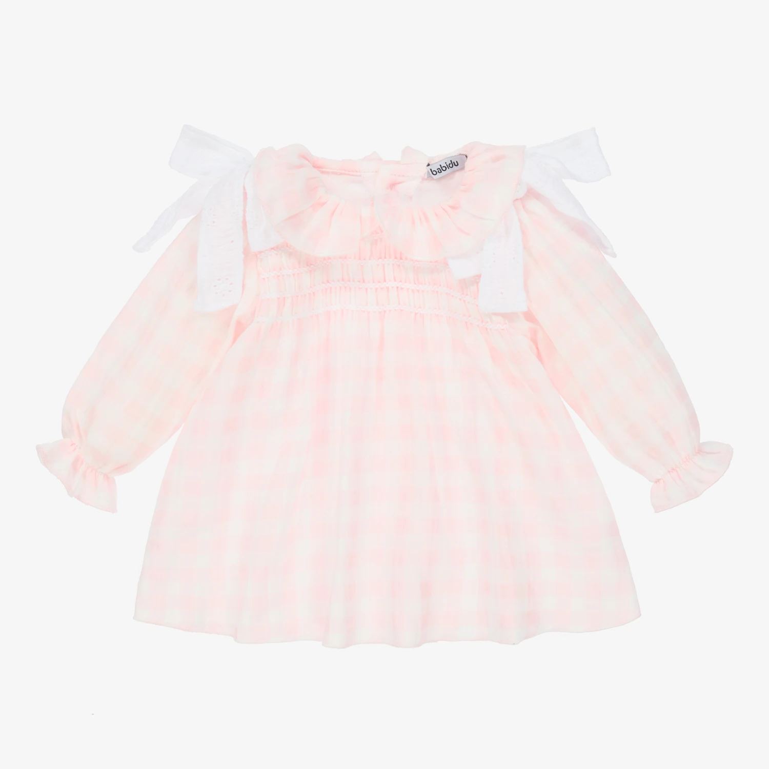 Adorable pink and white checked dress and knickers set for little girls from Babidu, made in beautifully soft and lightweight muslin. The dress has a smocked bodice and white broderie anglaise bows on the shoulders. The cuffs are elasticated with pretty ruffles that match the collar, and the dress fastens with buttons on the back.
