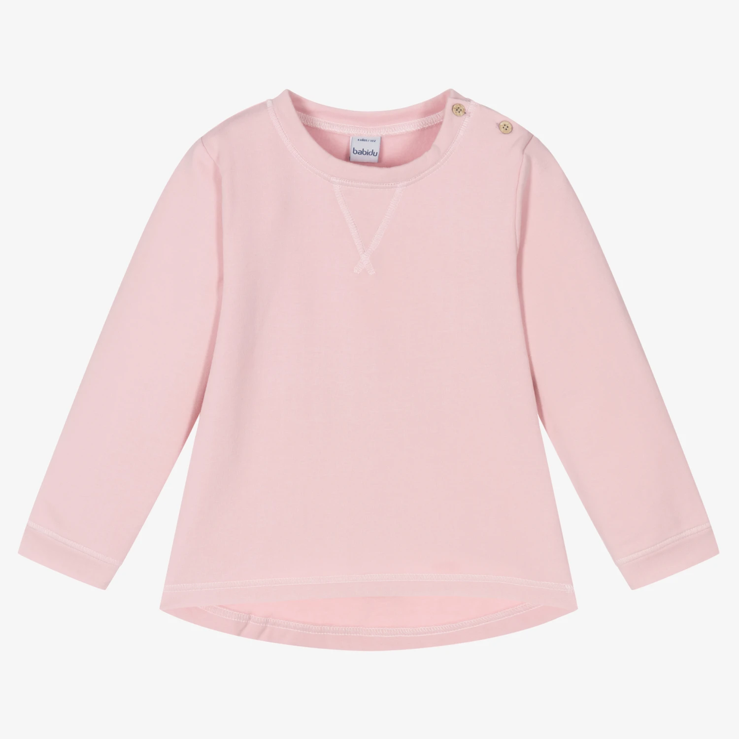 Super soft pink sweatshirt for younger girls by Babidu. Made in comfortable cotton jersey with a cosy brushed feel inside, it has the classic V-stitching on the neckline and coconut button fastenings on one shoulder. The hem is shaped and longer at the back.