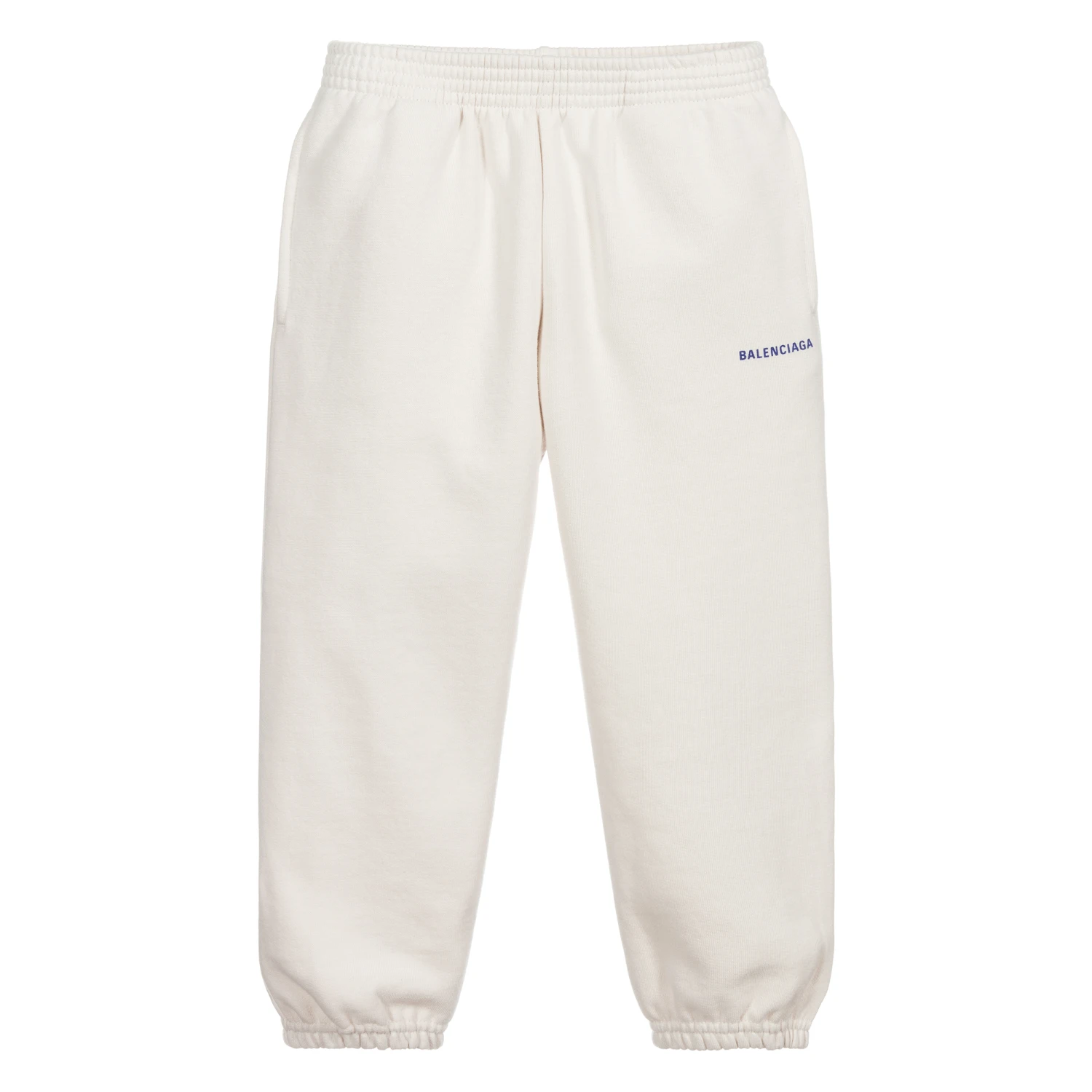 Designed for boys and girls, a beige pair of joggers by luxury brand Balenciaga, with a blue logo print on one leg. Made from soft midweight cotton jersey, with a cosy fleecy inside. These casual trousers have side pockets and an elasticated waistband and cuffs.